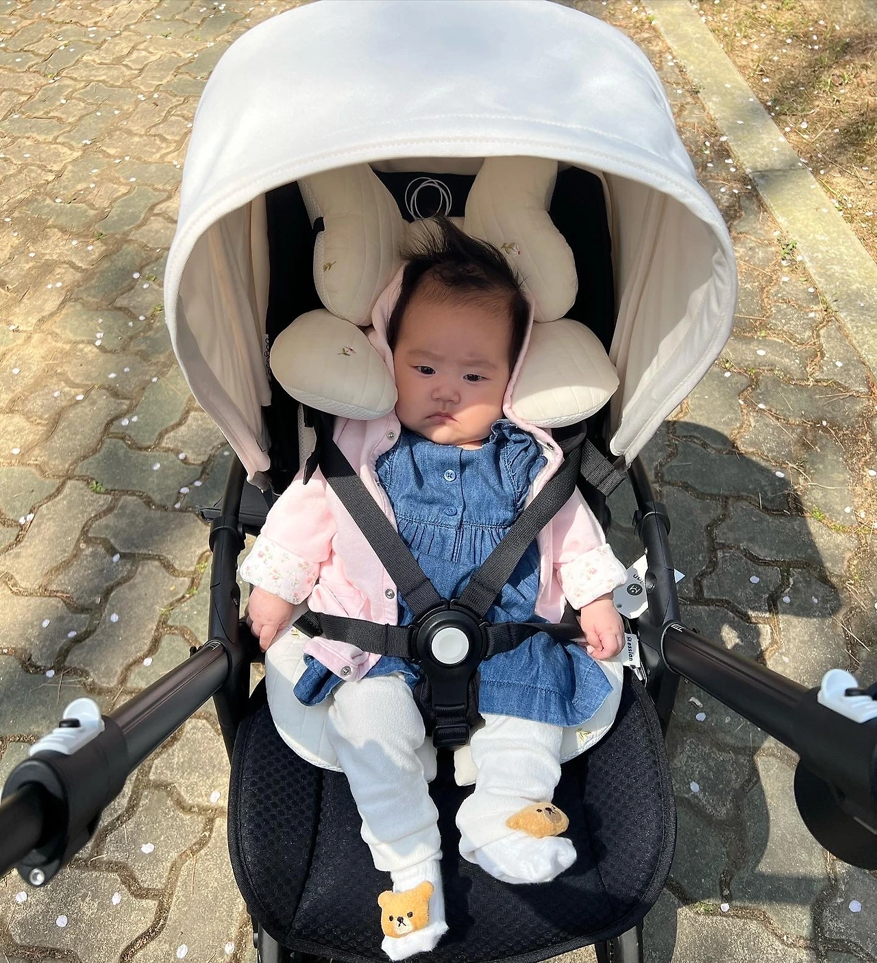 아직 80일 아가라 필수 준비물은 유모차 + 목베개입니다. 아직 목을 가누지 못해서 고정을 해줘야 하거든요. 사진을 보시면 아가 목이 딱 고정되어 있습니다. 다소 뾰로통한 모습이네요. 우리 아가는 산책 중에 반 정도는 졸거나 잤답니다. 그래도 햇살도 맞고, 흩날리는 벚꽃들도 구경하며 신기해하지 않았을까 소망해 봅니다.