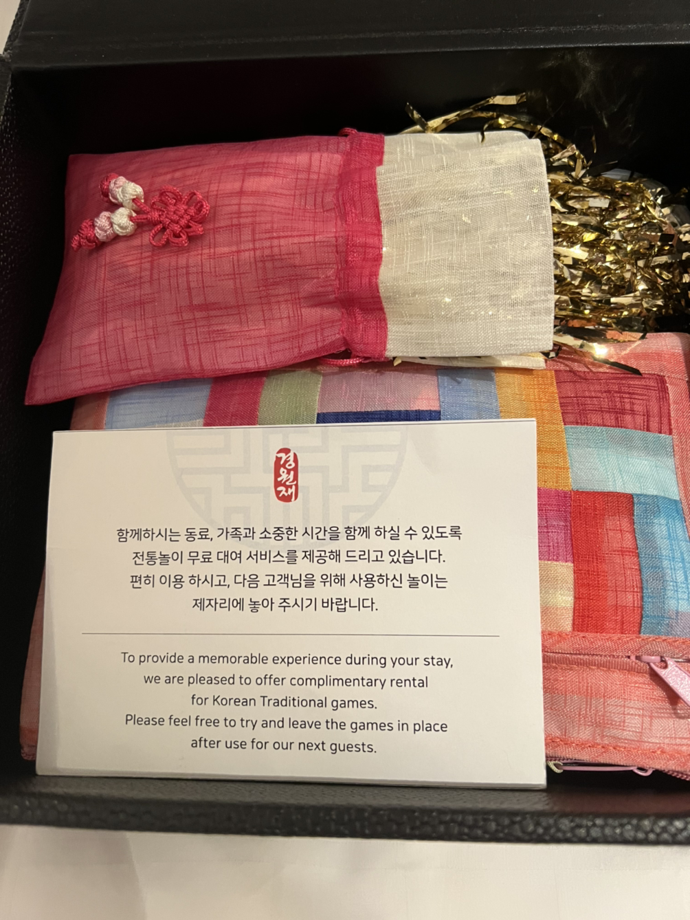 방안에는 센스 있게 전통놀이 무료 대여 서비스도 준비되어 있습니다. 윷놀이, 공기놀이, 제기 등이 들어 있네요. 예전 생각이 납니다.