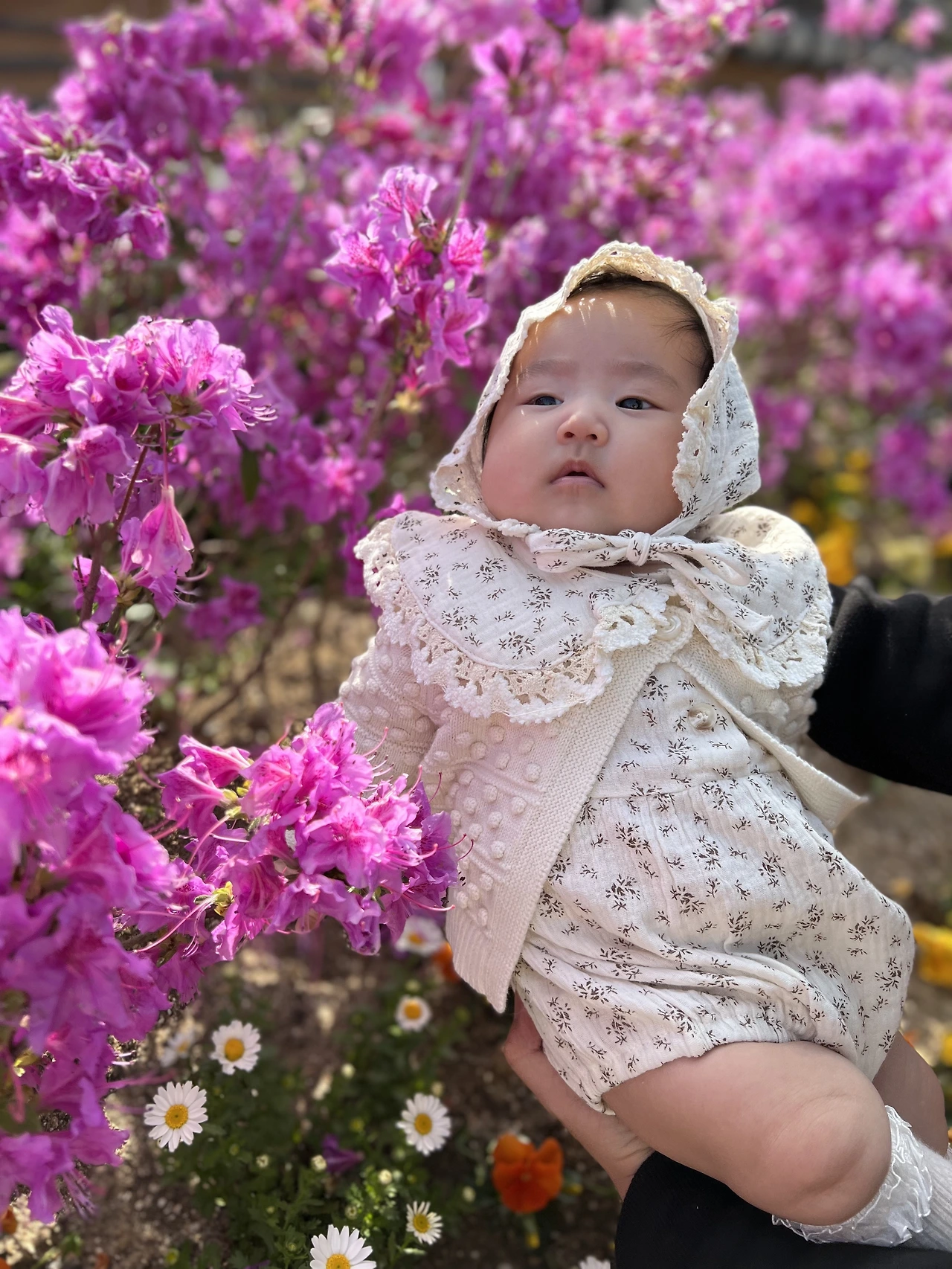 날씨도 따뜻하고 완연한 봄입니다. 경원재 내부 곳곳을 둘러봅니다. 전통 놀이 체험존도 있고, 잉어가 가득 들어있는 작은 연못도 있습니다. 꽃도 이쁘게 심어져 있어서 '꽃보다 아가' 사진을 촬영해봤습니다. 아직은 수유 텀도 낮잠 텀도 있어서 길게는 밖에 있을 수가 없습니다. 30분 내외로 짧게 둘러보다가 다시금 객실 내부로 돌아와 수유를 합니다.