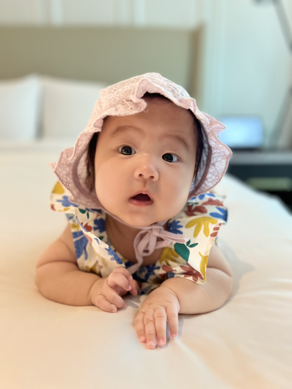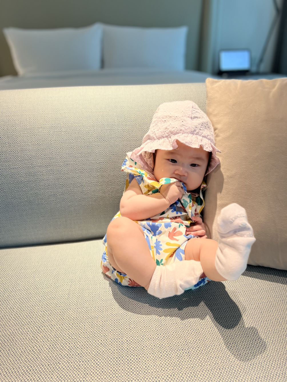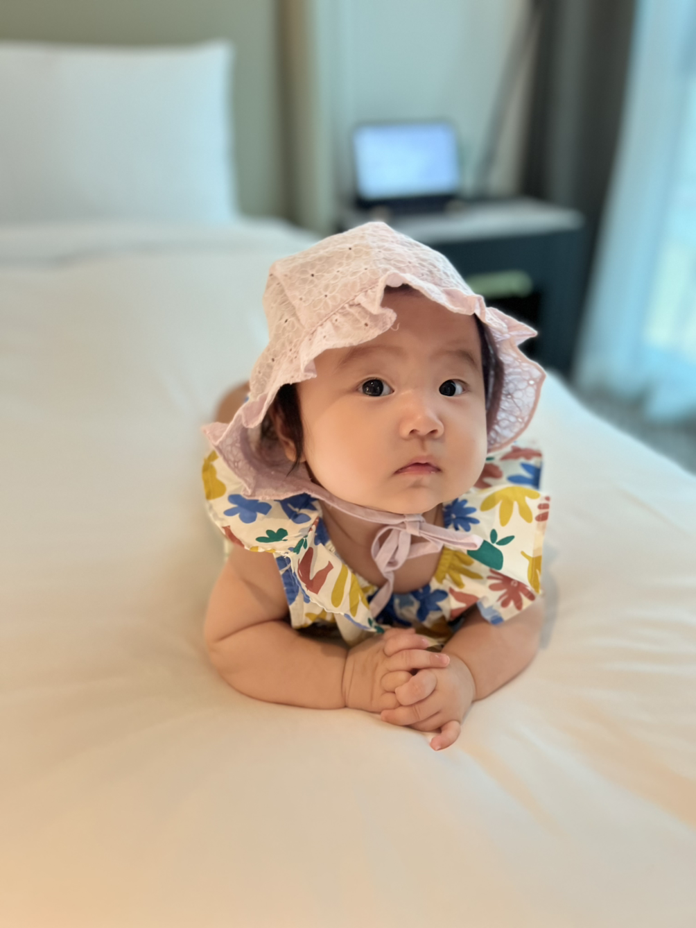 호캉스를 하려고 아기도 이쁘게 차려입고 왔습니다. 호텔을 배경으로 이런저런 인물 샷을 촬영해 봅니다. 역시 아이폰 13프로네요.