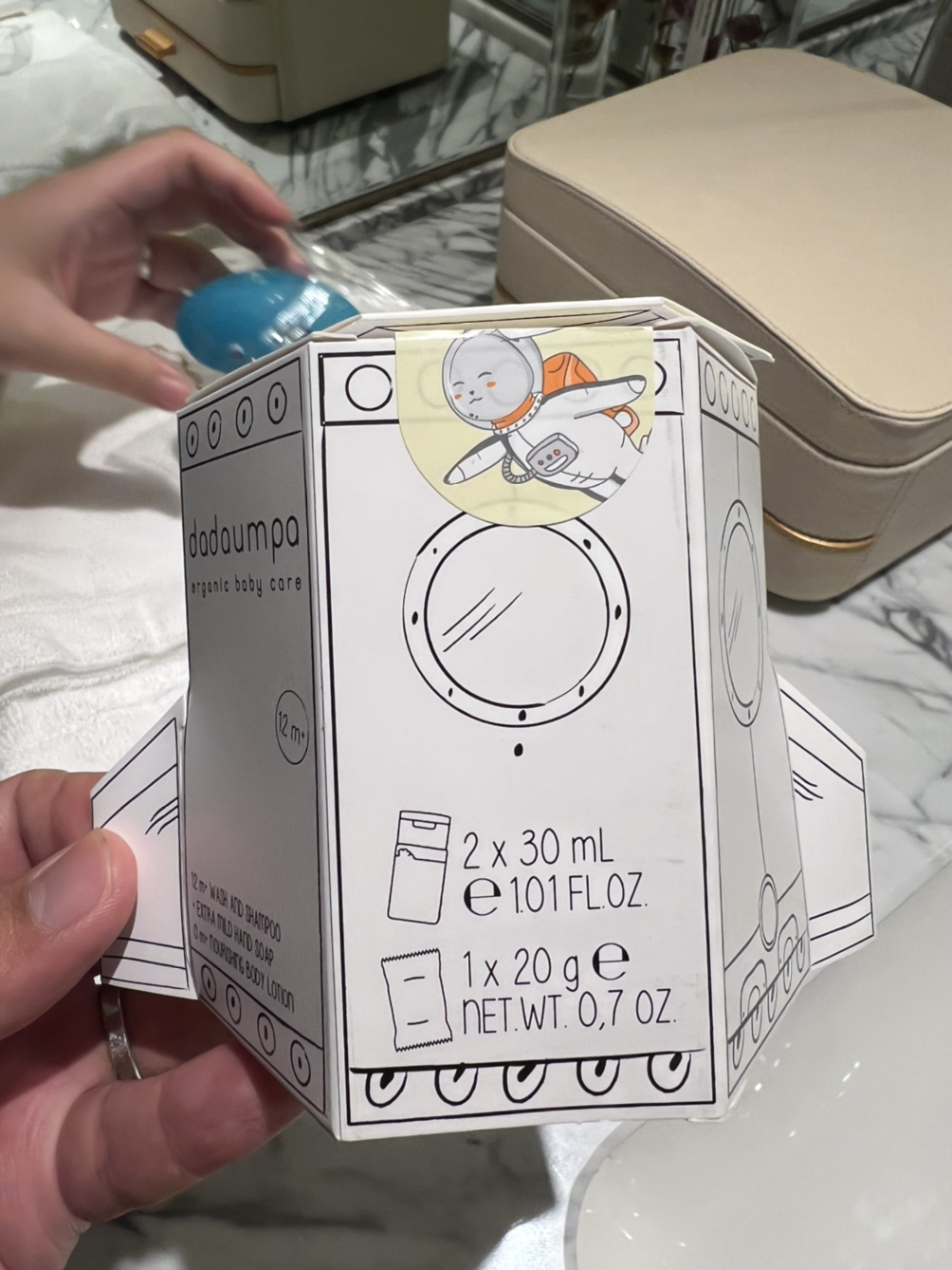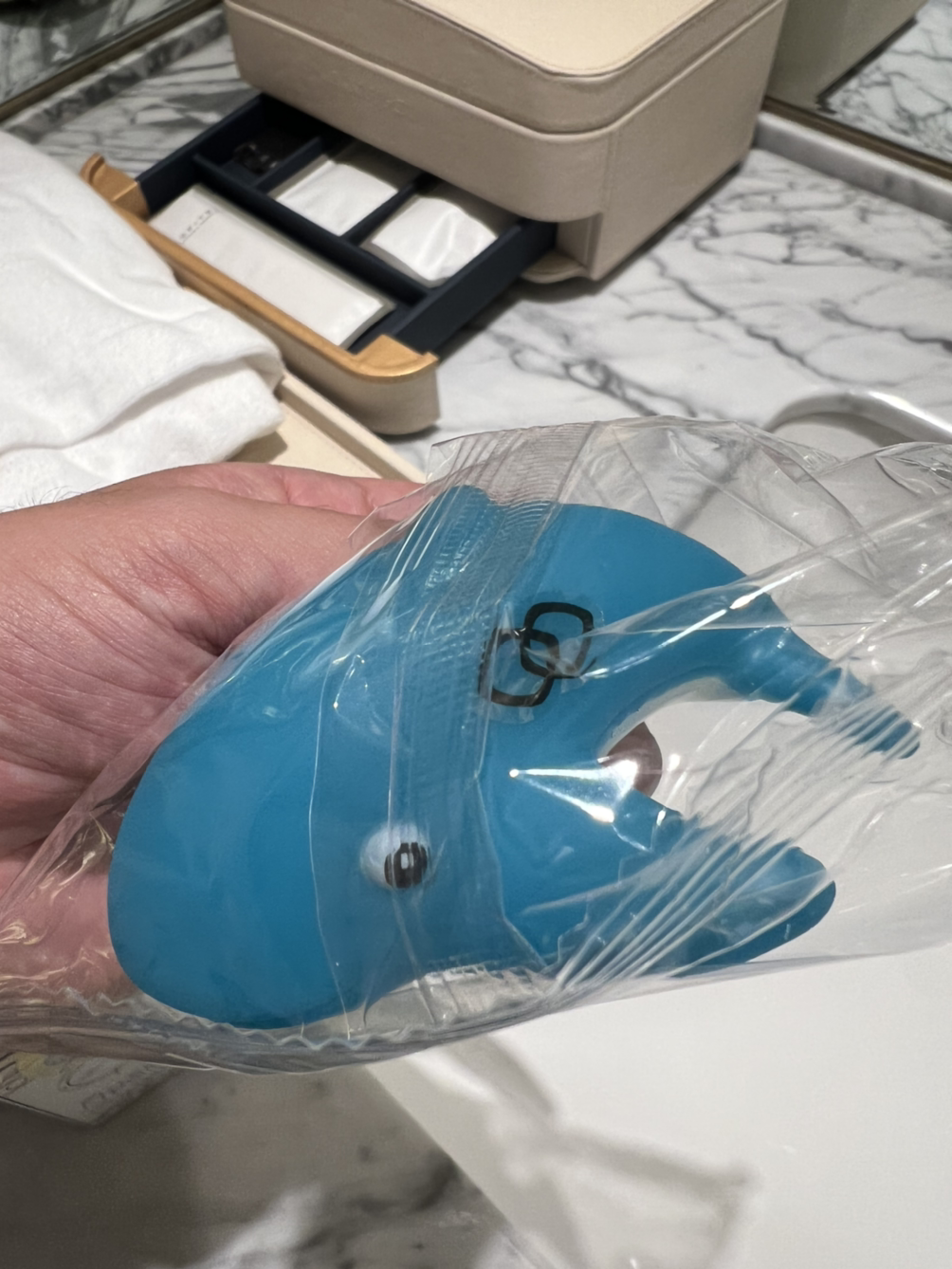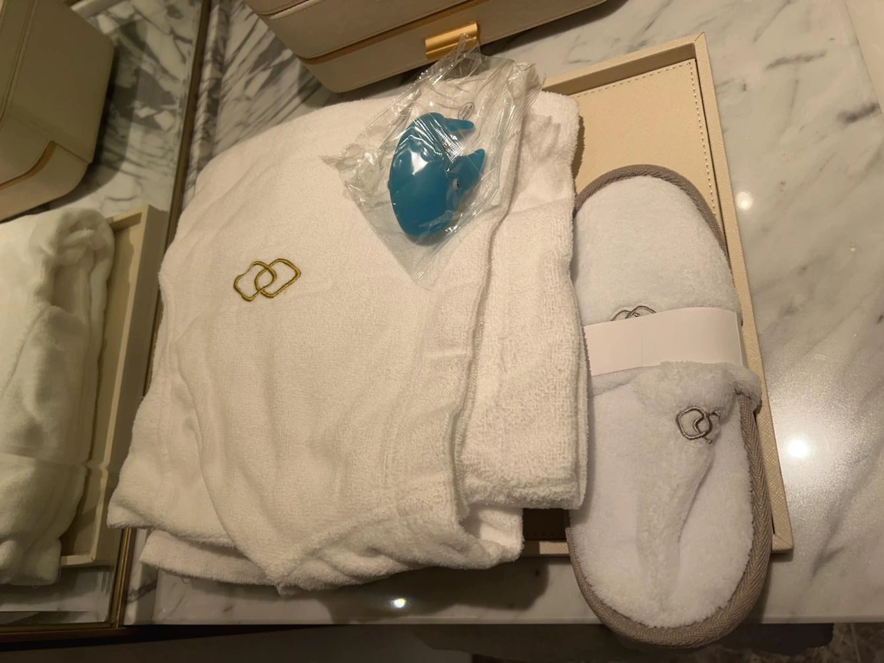 아이 전용 가운과 슬리퍼, 물놀이 장난감도 주셨습니다. 저희 아가에겐 아직 너무 큽니다 (그래도 착샷을 해보았습니다. 글의 하단에 사진이 첨부되어 있습니다)