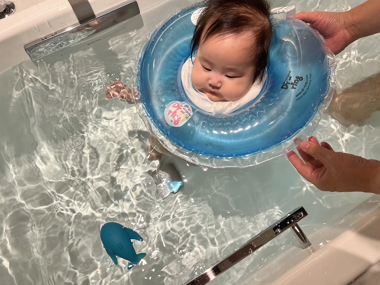 아쉬운 마음이 드니 우리 아가는 객실 내 욕조에 물을 받아 목 튜브를 끼우고 수영을 시켜줬습니다. 이제는 10~15분 정도 수영해도 아기 컨디션이 괜찮은 것 같습니다. 목 튜브 수영도 이제는 많이 익숙해진 모습입니다. 물에 둥둥 떠다니며 스스로 발차기를 하며 돌아다닙니다. 돌고래 물놀이 장난감에는 아직은 관심이 없는 것 같네요.
