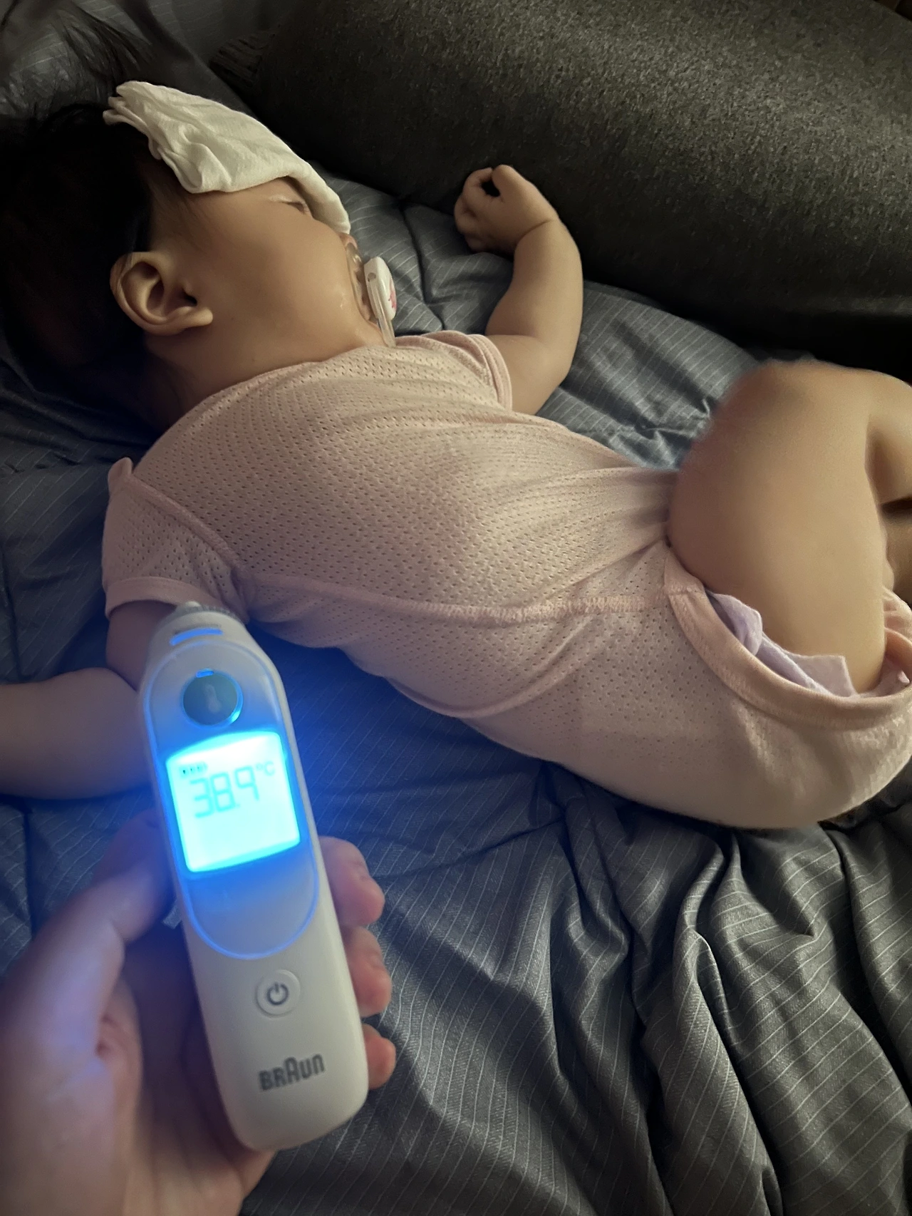 그렇지만 무심하게도 엄마 아빠가 거의 증상이 호전될 즈음 아기가 새벽에 깨서 잠에 다시 못 들어서, 느낌이 싸해서 온도를 재보니 38.5도가 나왔다. 올 것이 왔구나 해서 아내를 깨우고 119에 전화해서 가이드라인을 물어보니, 일단 집에 있는 아기용 해열제를 4시간마다 먹이고, 열이 안 떨어지면 미지근한 물을 묻힌 수건으로 몸을 닦아주며 온도를 내려야 한다고 가이드라인을 주셨다.
