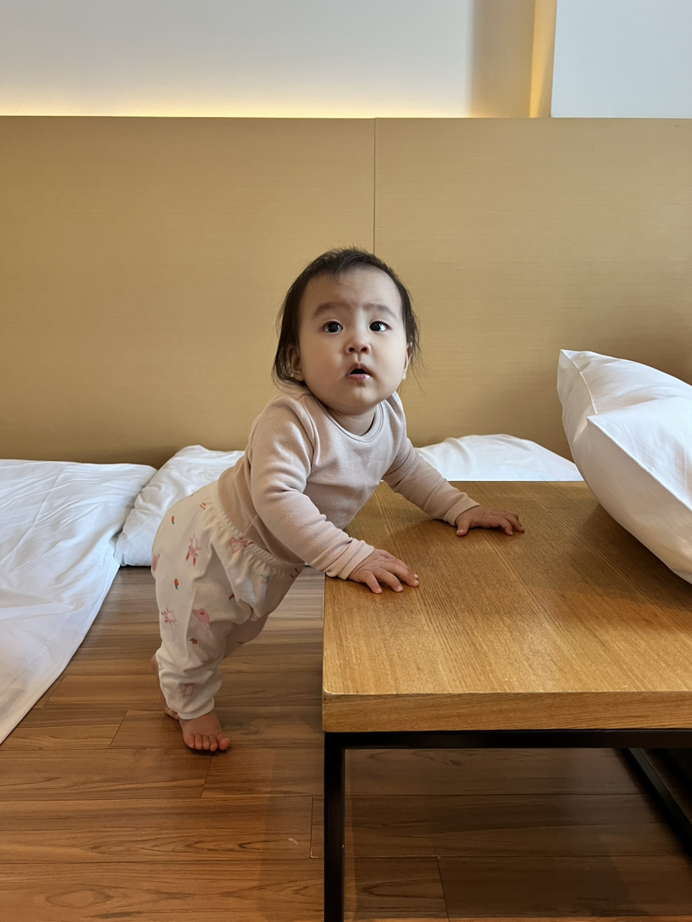 다행히 차도 안 막히고 아기 컨디션도 잘 따라줘서 양양 낙산까지 수월하게 올 수 있었습니다. 낙산비치호텔을 체크인하고 인근 낙산사를 둘러보았습니다. 겨울바다라 바람이 매서워서 아기를 꽁꽁 싸매고 다녀왔네요. 호텔은 아가가 아주 어릴 때는 아기침대 혹은 아기침대+가드를 선호했는데, 이제는 너무 굴러다녀서 온돌방을 예약할 수밖에 없었습니다. 아무래도 잘 때 마음이 편하긴 하더군요. 다만 온돌 특성상 바닥은 뜨겁, 공기는 비교적 차갑고 이래서 아기가 감기가 걸리지 않을까 걱정이 되기도 했습니다.