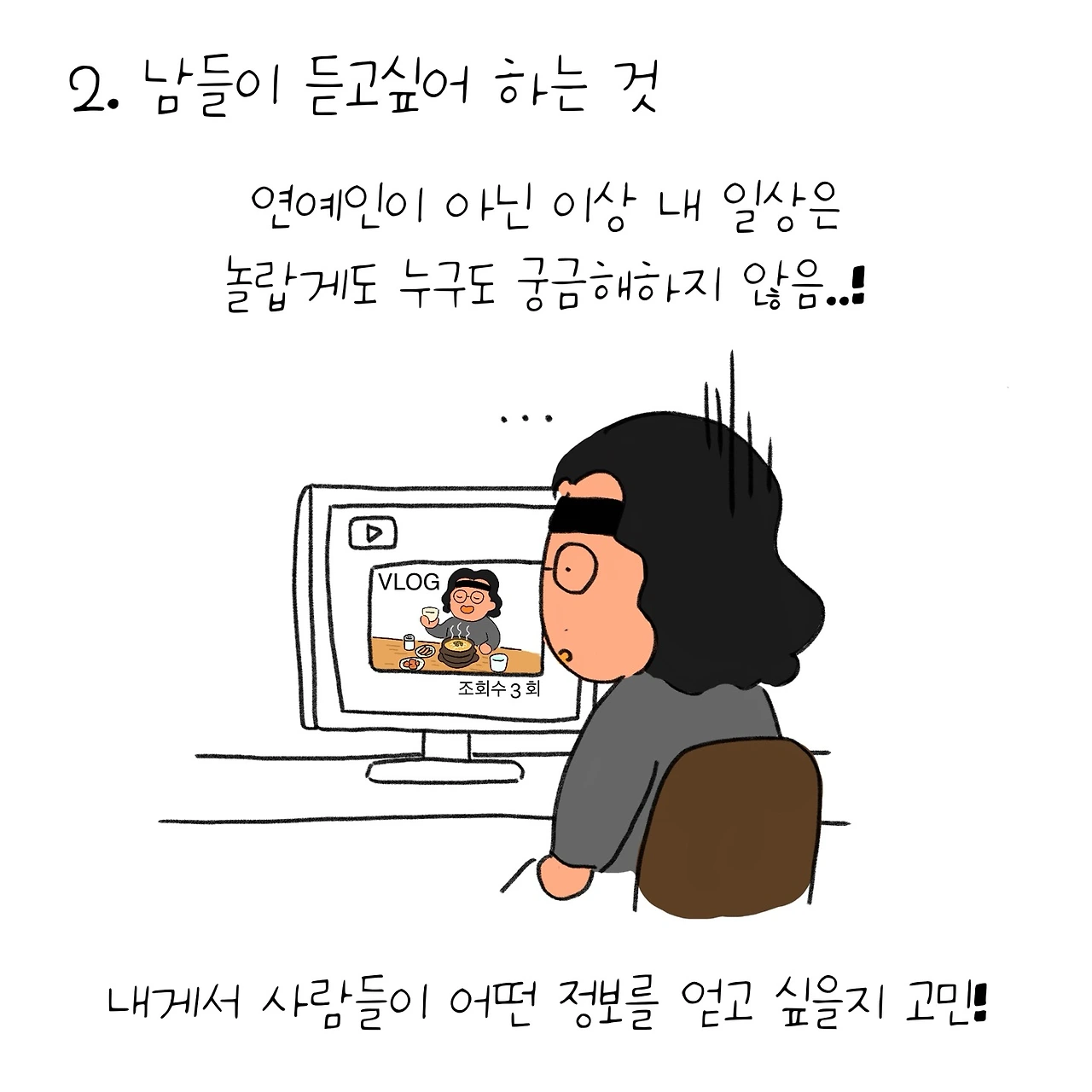 연예인이 아닌 이상 개인의 일상이나 vlog로 차별적으로 구독자를 확보하기는 아주 어렵습니다. 종종 연예인의 브이로그도 조회 수가 안 나오기도 하죠. 요즘 많은 사람들이 어떤 주제에 관심이 있고, 또 찾아보는지를 파악해야 합니다.
