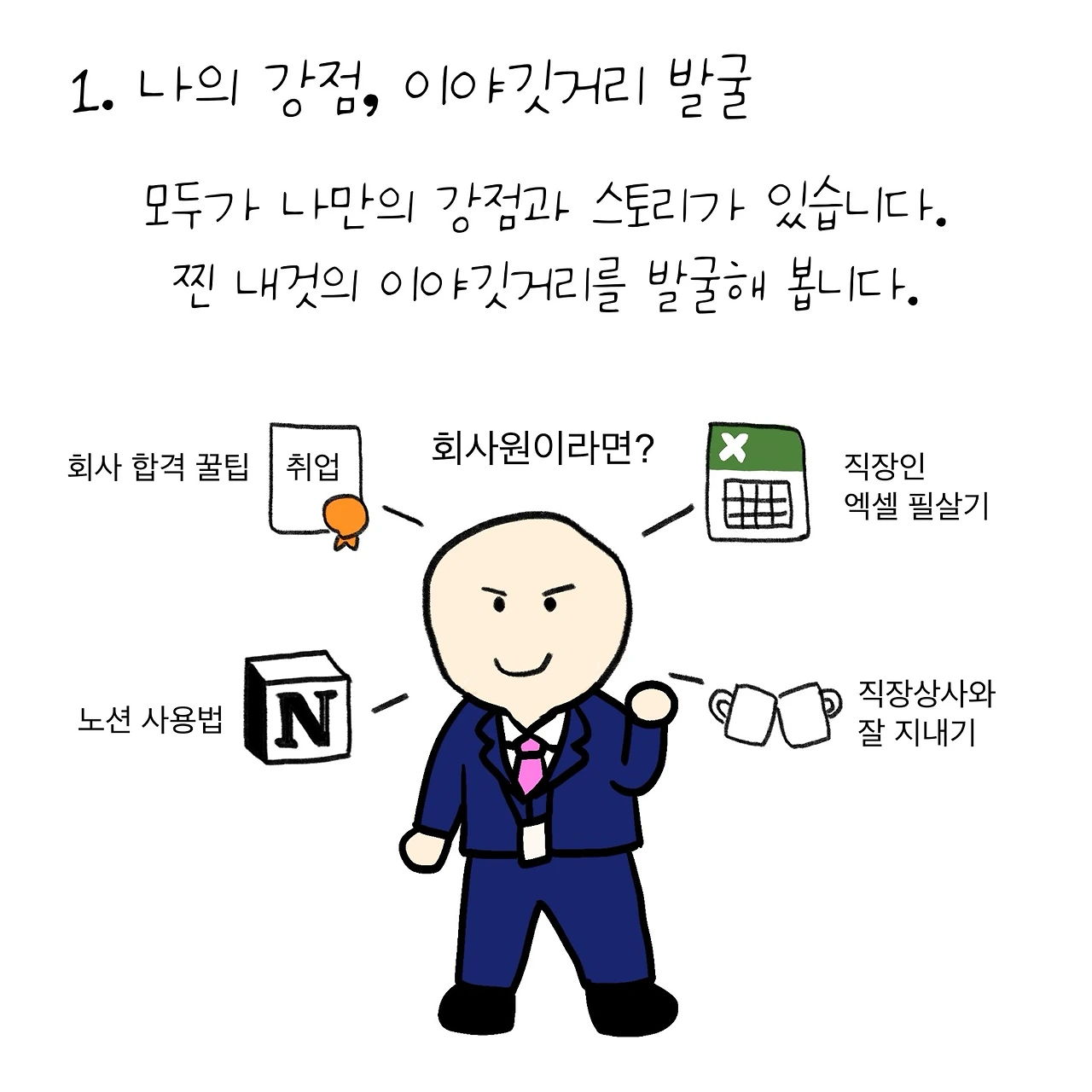 누구에게나 스토리가 있습니다. 일반 회사원이라고 해도요. 그 회사에 취직한 팁, 사회생활 노하우, 퇴사를 꿈꾸는 삶 혹은 커리어를 발전시키는 삶, 직장인 재테크 등이요.