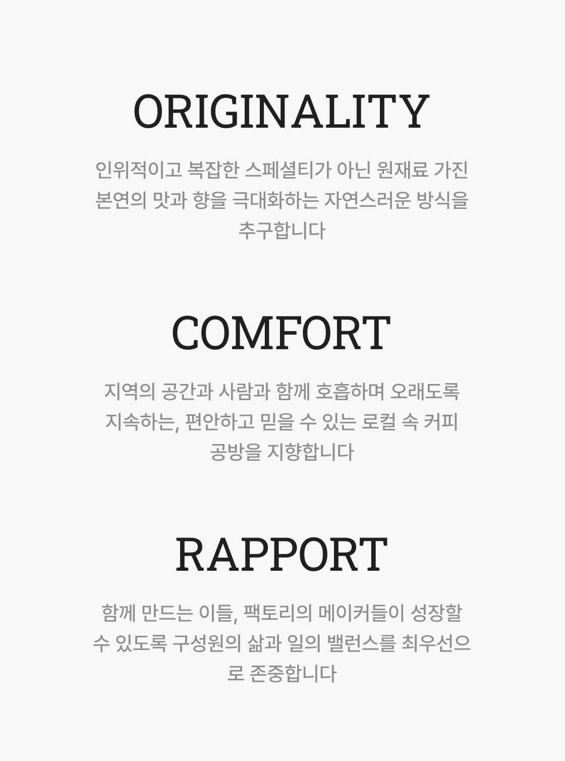 재료에 대한 존중, 로컬에 대한 존중 그리고 함께 일하는 이들에 대한 존중. 스티머스 일원들은 이 존중하는 마음을 유지하고 가꾸어 나갈 때 스페셜티 본연의 것들 - 본연의 테이스트, 본연의 로컬 바이브, 본연의 관계 - 을 소중히 지켜나갈 수 있다고 믿는다. 이리하여 스티머스만의 브랜드 바이브는 [Respect Original, 스페셜티 본연의 것에 대한 존중]으로 집약할 수 있다.