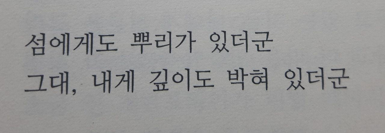 우리가 서로를 섬이라고 할 때, 내가 당신이라는 섬을 발견했을 때, 이미 왜, 참 부단히도 살아낸 존재들인 것이다. 바다의 수심에 잠기지 않기 위해서, 파도에 휩쓸려 떠내려가지 않기 위해서.