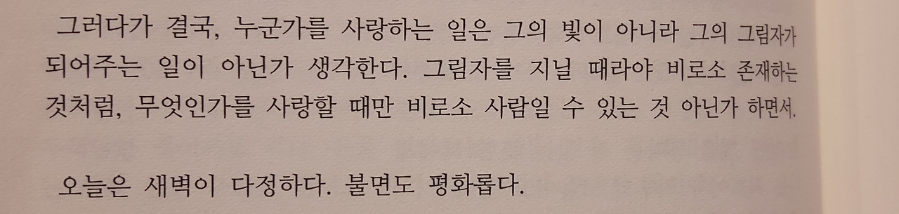 그러다가 결국, 누군가를 사랑하는 일은 그의 빛이 아니라 그의 그림자가 되어주는 일이 아닌가 생각한다. 그림자를 지닐 때라야 비로소 존재하는 것처럼, 무엇인가를 사랑할 때만 비로소 사람일 수 있는 것 아닌가 하면서.