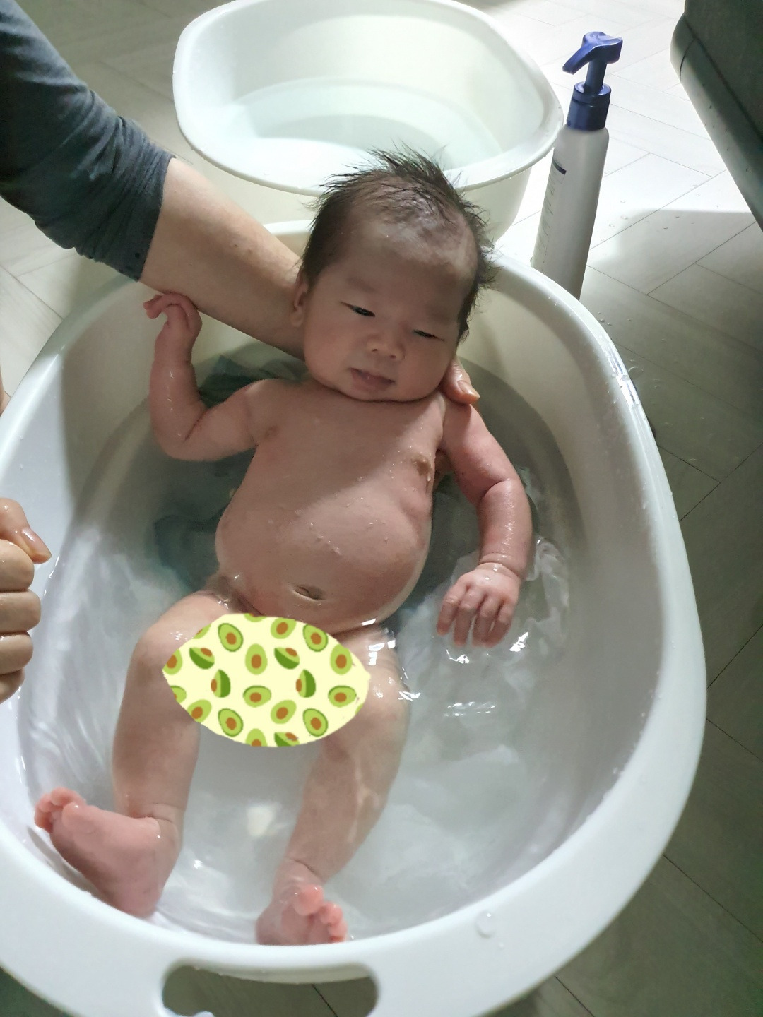 신생아에게 목욕은 중요한 일인 것 같다. 하루 온종일 누워 있다 보니 등이 짓무를 수도 있고 몸에 열도 많다 보니 (성인 대비 약 1도가 높다) 매일 목욕시켜줘야 한단다. 마치 성인한테는 샤워 같은 것이라고 보면 되겠다. 엄마 아빠 입장에서는 아기의 온몸을 자세히 살펴보는 점호(?) 같은 일이라고 보면 된다. 호박이의 경우도 자주 울다 보니 열이 많아 배와 등에 발진이 일어난 것을 보고 수딩 크림을 발라서 진정시켜줄 수 있었다.