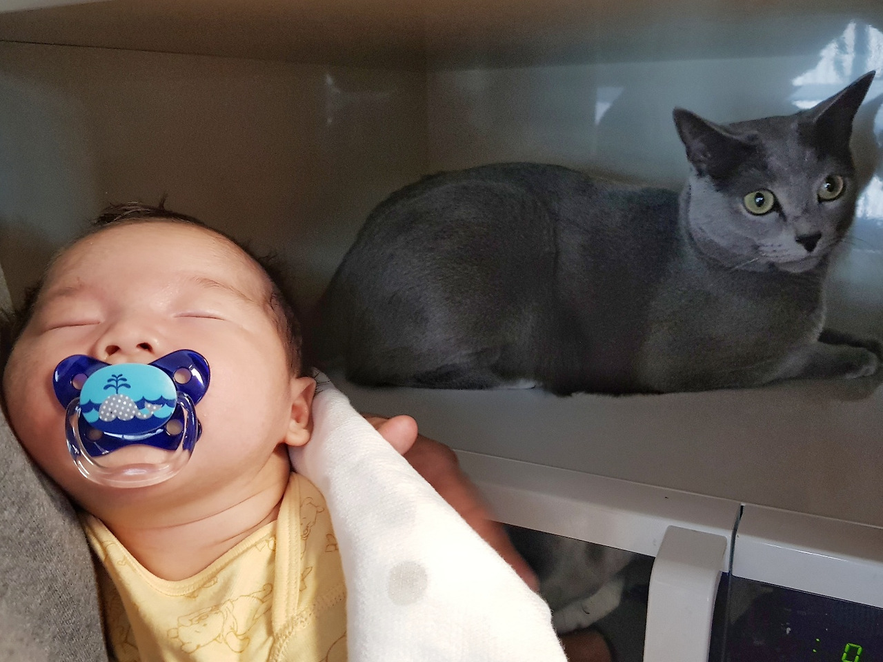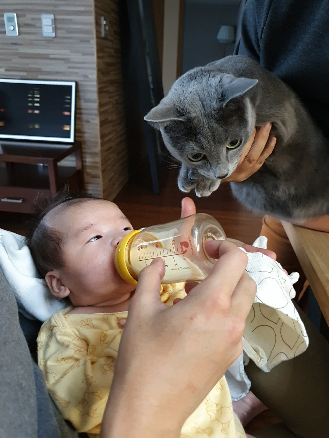 식사를 하는 동안 호박이는 소파에 눕혀뒀는데 갑자기 고양이가 호박이 쪽으로 이동을 하길래 내가 반사적으로 튀어 나갔다. 실제로 고양이는 호박이 근처에도 가지 않았는데 오히려 내가 급박하게 움직여서 고양이가 나를 보고 놀랬다. 마음이 아프지만 그래도 아기가 먼저이니 고양이도 이 못난 형을 이해해주길 바란다.