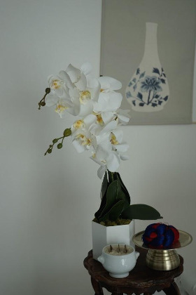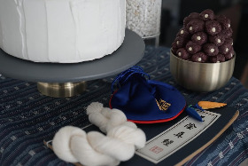 '고이 테이블'이라는 전문 업체에서 포토 후기를 보며 정갈하고 단아한 느낌의 블루기와 세트로 정했고, 얼굴이 하얀 호박이를 생각해서 푸른색이 들어간 한복도 대여를 신청했다. 큰 이사 박스 2개에 걸쳐 모든 준비물이 왔는데 동봉한 설명서와 사진으로 무리 없이 세팅할 수 있었다. 예산은 상차림에 15만 원 정도가 들었다. 집 벽지가 모두 하얀색이고, 남서향으로 햇볕이 잘 들어 별도 옵션을 선택하지 않아도 되었다. 테이블도 집에서 쓰는 식탁으로 했는데 전혀 비좁지 않았다.