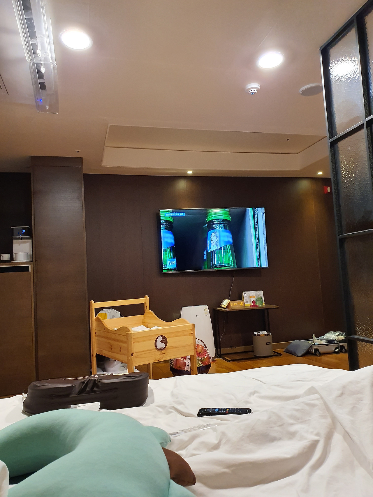 대박. 들어가자마자 탄성이 절로 나온다. 우리 집 거실 크기의 2배가량의 방이 있고, 심지어 침대와 응접실 (소파, 리클라이너, 탁자 등)이 분리되어 있다. 화장실도 어마어마하다. TV도 최소 65인치 이상, 공기청정기, 시스템 에어컨, 바운서, 애기 침대, 좌욕기 등등 없는 것이 없다. (나중에 알았지만 S 유축기도 시가 4~500만 원이라고 한다)