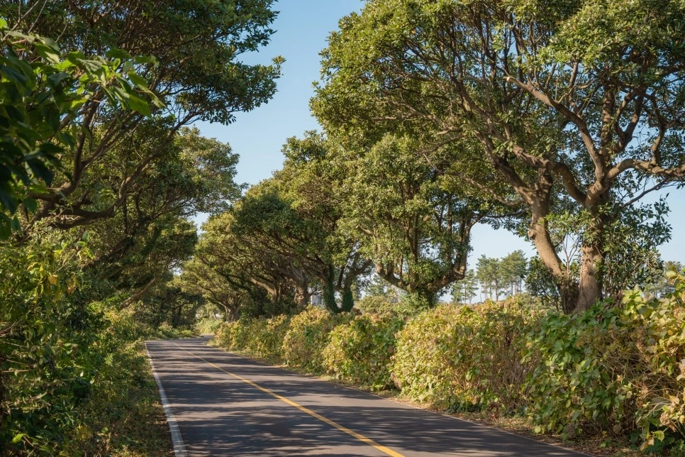 뚜벅이 여행자라면 비자림 버스정류장에 내리자. 사진 속 풍경이 펼쳐지는 곳을 바로 만나볼 수 있다. 인도가 없어 걷기 좋은 길은 아니지만, 수국이 피는 시기에는 꼭 방문해 보길 추천한다.