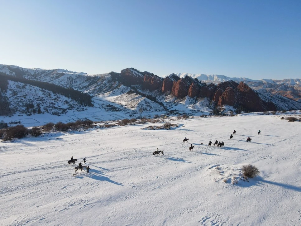키르기스스탄의 그랜드캐년이라고 불리는 스카즈카협곡. 이식쿨 호수의 남쪽 해안에서 가장 아름다운 명소로 꼽힌다. 붉은 바위들과 산세 덕에 이국적인 느낌이 제대로 풍기는 사암 지대이다.