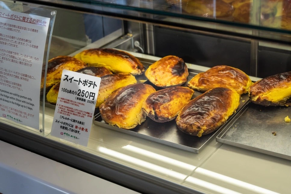 원하는 제품을 고르면 바로 무게를 재서 포장해 주는 방식. 가격은 100g에 250엔이며, 작은 사이즈의 스위트포테이토 기준 약 1,000엔 (10,000원) 정도다.
