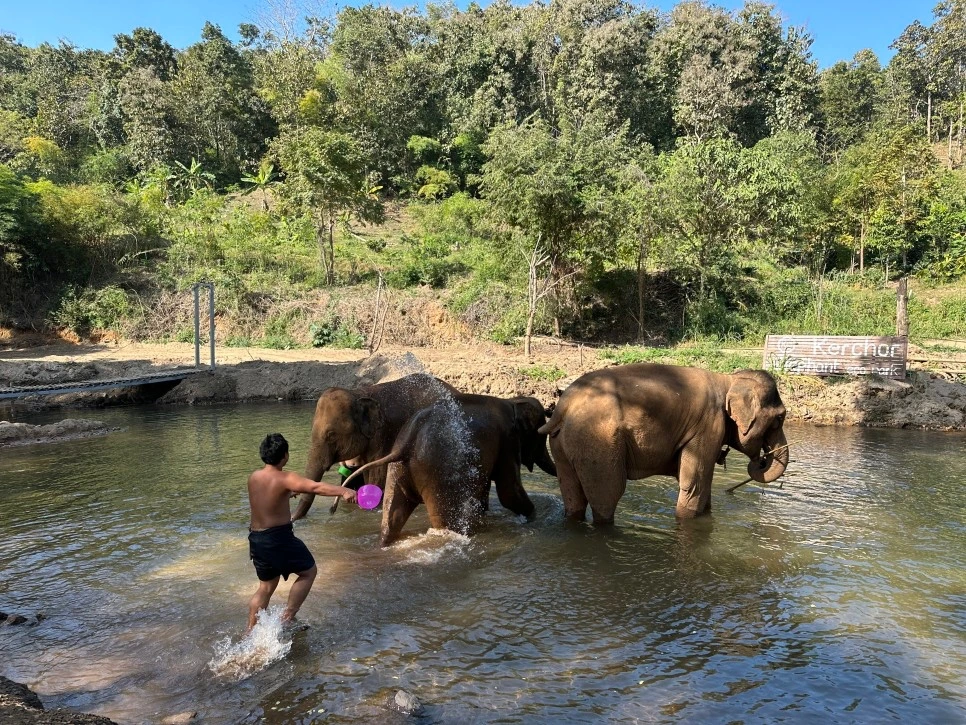 산책이 끝나면 코끼리와 함께 물에 들어가 샤워하는 것을 돕는다. 샤워하는 동안 코끼리는 물속에 눕기도 하고, 코로 물을 뿌리며 장난을 친다. 온몸은 다 젖지만 코끼리와 함께 즐거운 추억을 쌓을 수 있다.