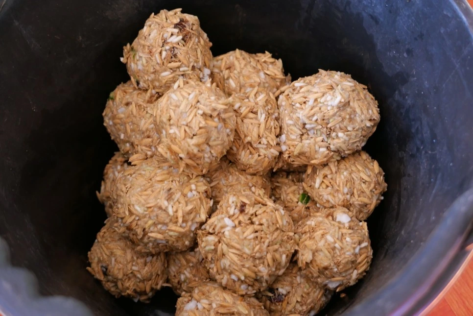 바나나, 통밀, 굵은소금, 타마린드, 웜우드 등 비타민이 풍부하고 기생충을 죽이는데 좋은 특별식을 직접 준비해 주먹밥처럼 만들어 코끼리를 만날 준비를 한다.