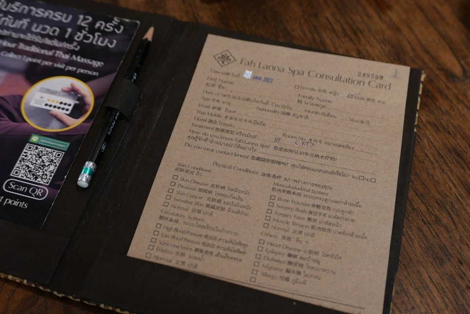 다채로운 수상 경력을 가진 마사지 전문샵 Fah Lanna Spa. 개인 맞춤형 마사지를 위해 개인 상담 카드를 작성하고, 오일의 종류도 직접 선택할 수 있다.