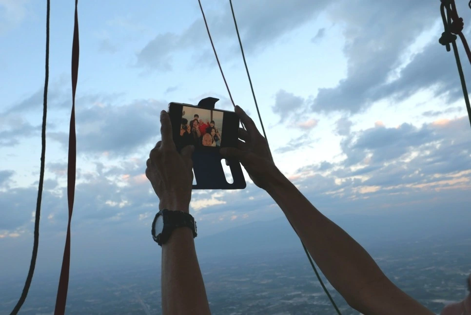 열기구가 어느 정도 고도에 오르고 안전한 상태가 되면 파일럿이 직접 팀별로 사진을 찍어주고 다 같이 단체 기념사진도 찍는다.