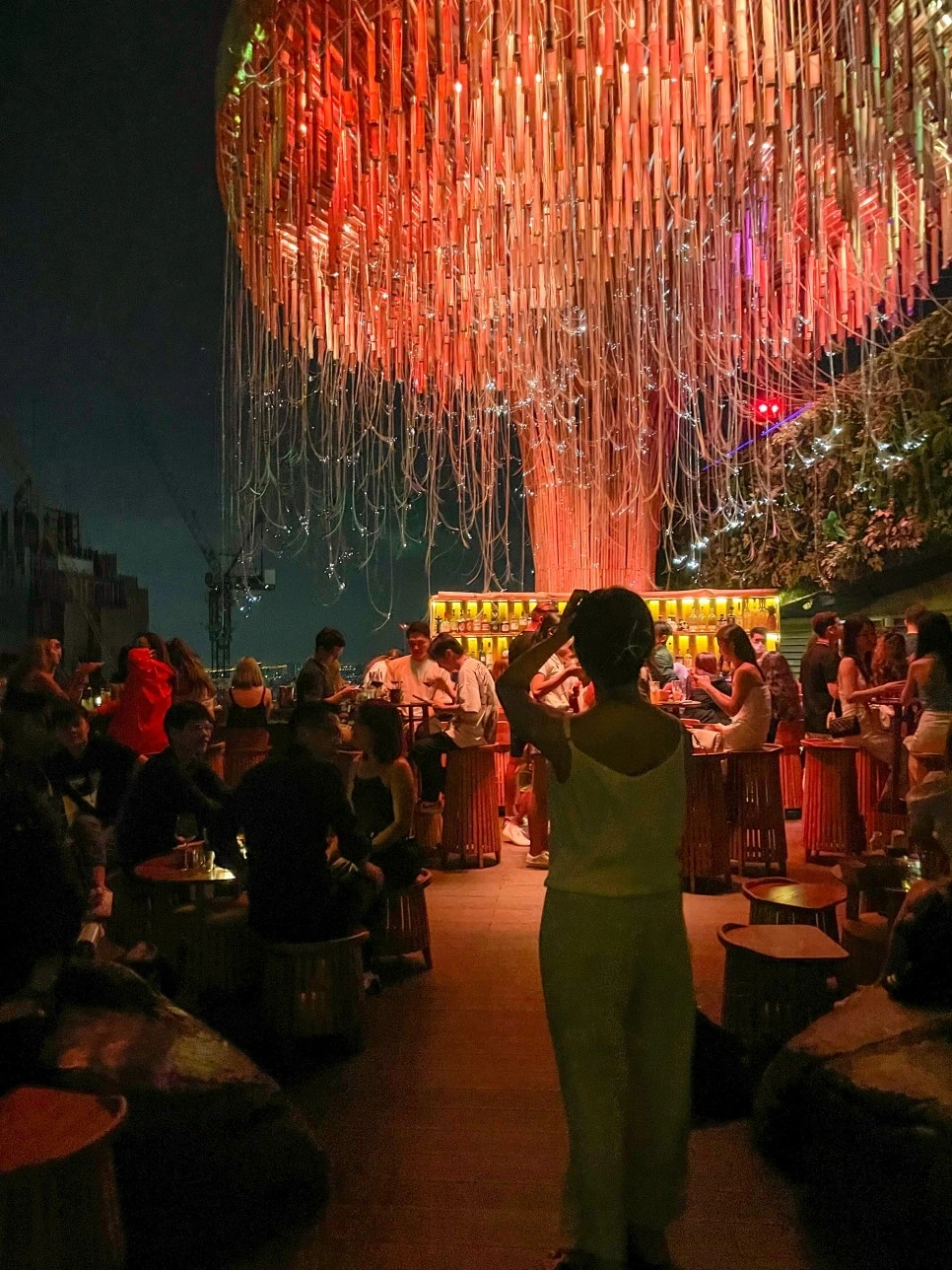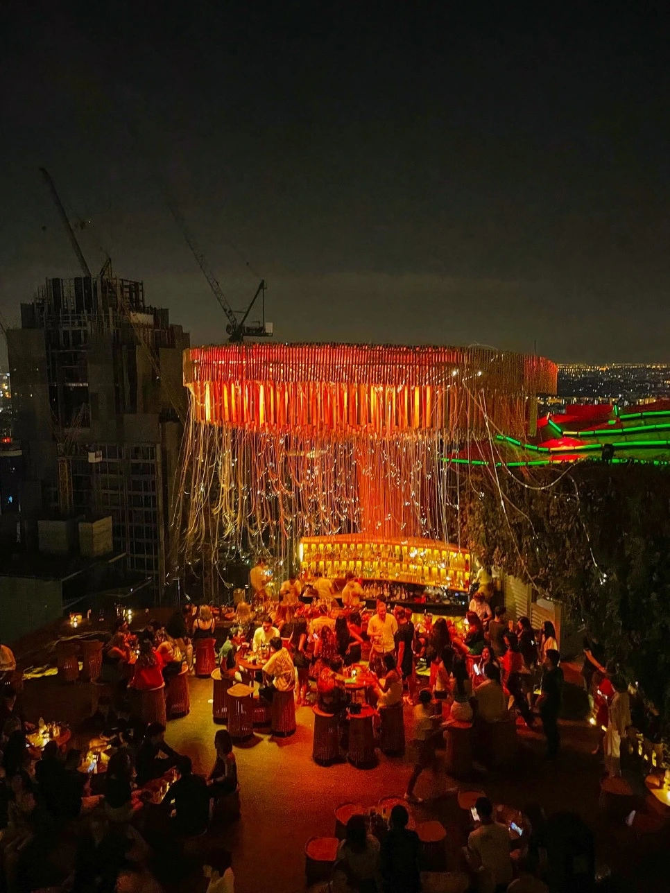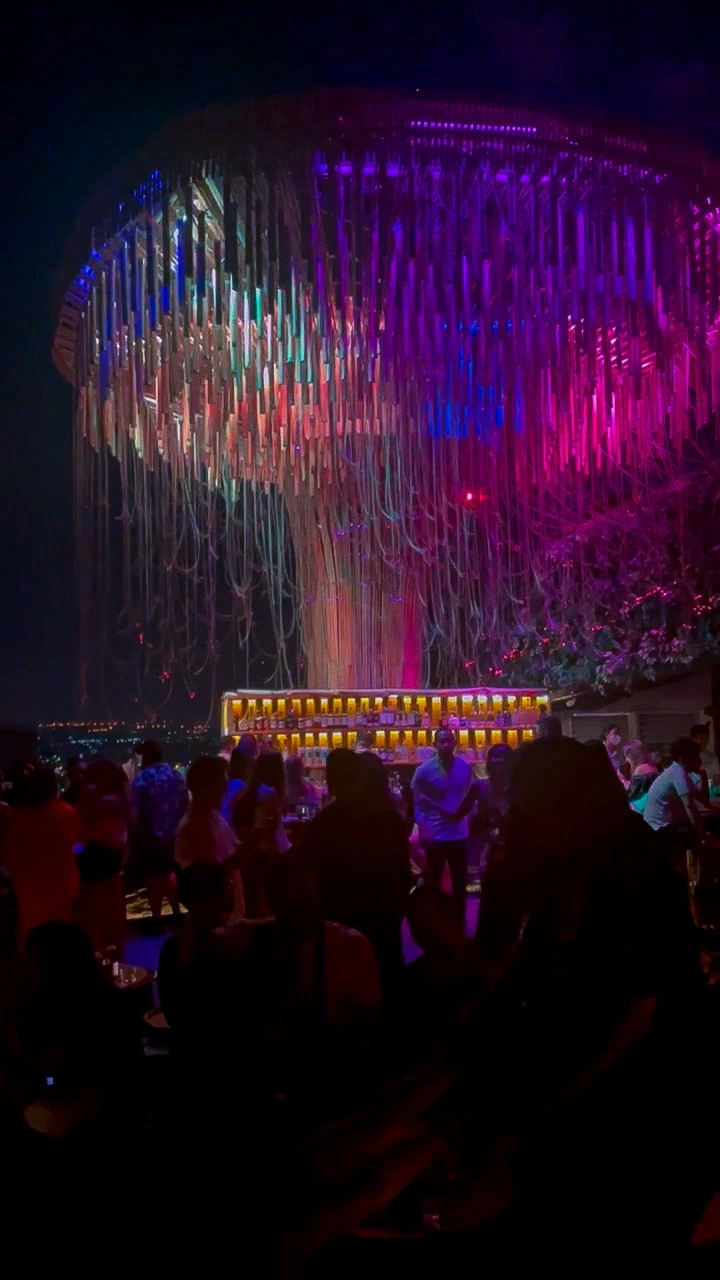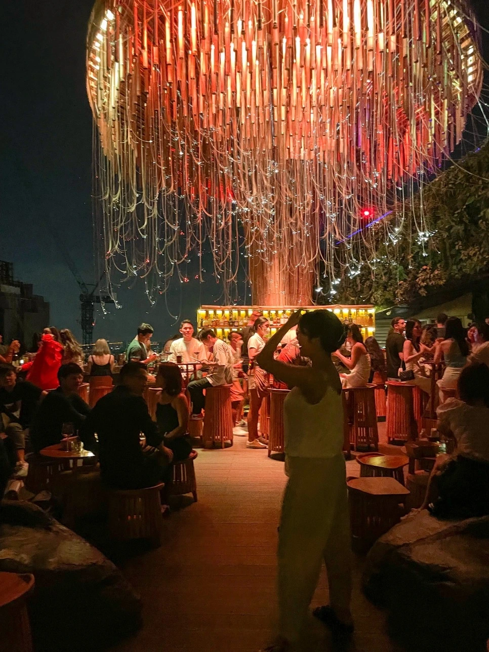 전체적인 티츄카 루프탑바의 모습이다. 큰 나무 조형물과 화려한 네온 사인이 포인트. 반짝거리는 방콕 야경과 루프탑 조명, 그리고 술까지. 분위기에 취할 수밖에 없는 장소다.