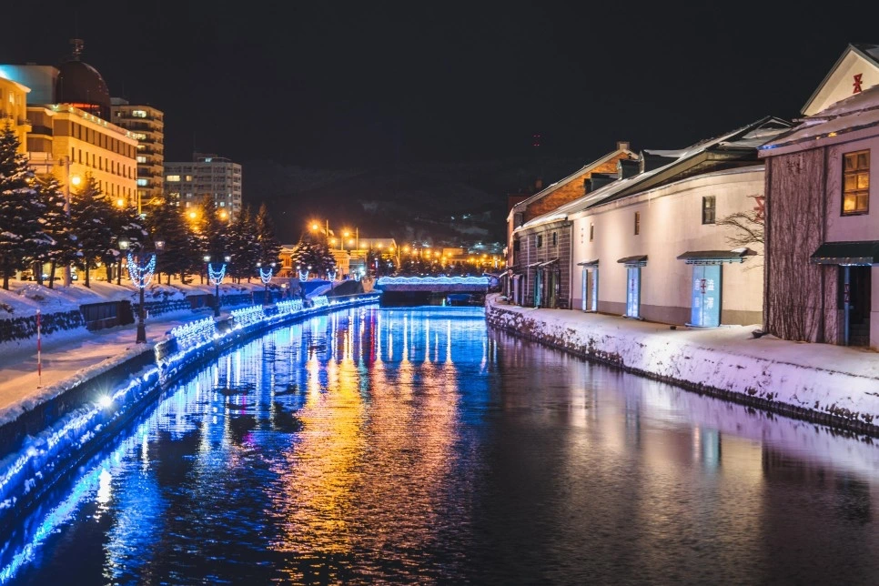 오타루의 또 다른 대표 관광지이자 야경 명소인 오타루 운하. 오타루 운하는 오타루 시내를 가로지르는 약 1km 길이의 운하다. 낮과 밤 다른 매력을 가지고 있는데, 겨울의 낮에는 눈으로 덮인 운하를, 밤에는 파란 조명이 빛나는 오타루 운하를 만날 수 있다.