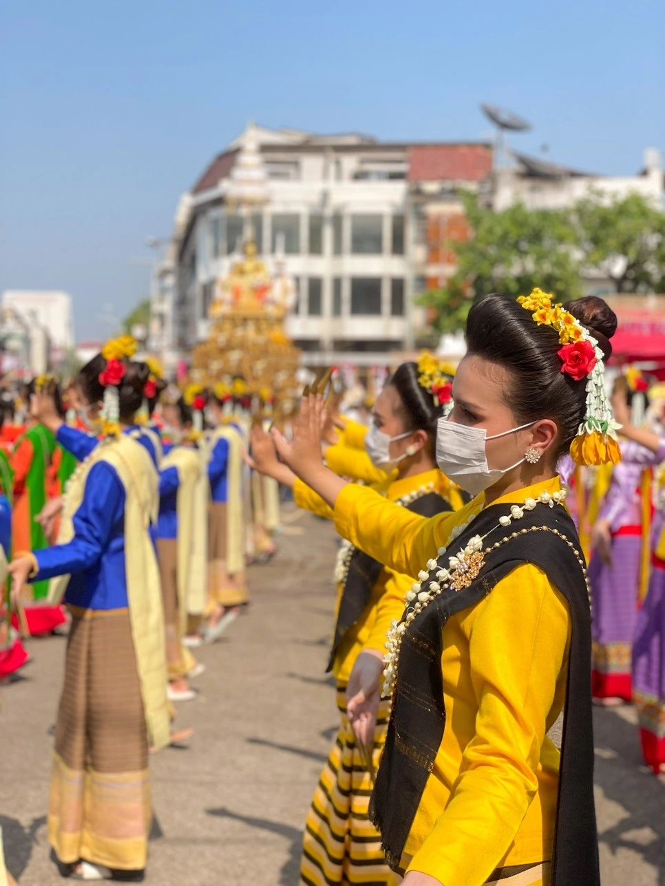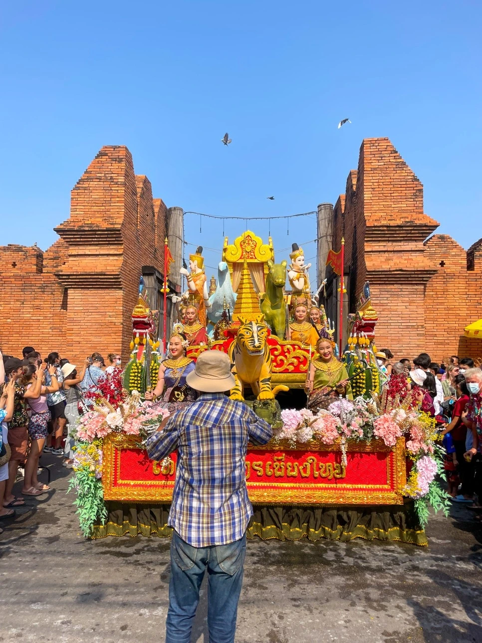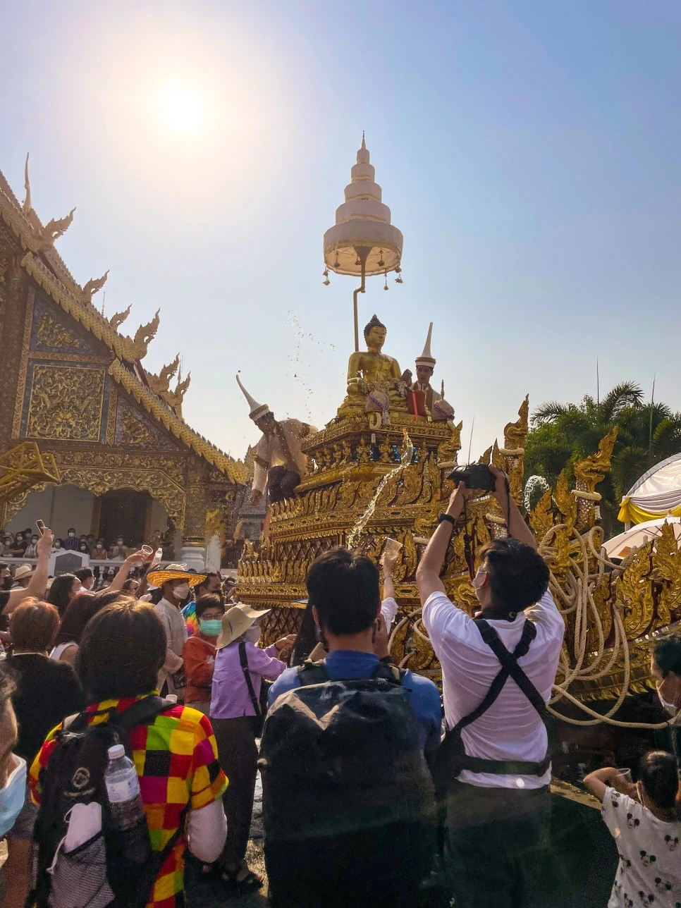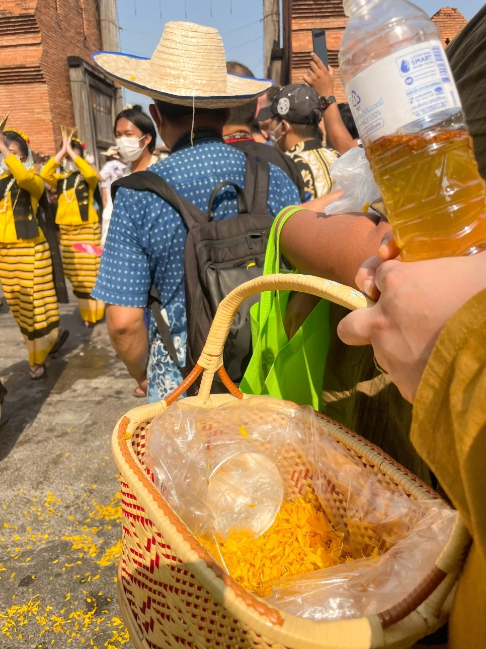 불상이 지나갈 때 사람들은 준비한 꽃과 기름 그리고 물을 뿌린다. 퍼레이드를 할 때는 최대한 불상에게만 던지고, 사람에게는 던지지 않도록 주의하자. 위 사진에 나오는 모습처럼 꽃과 향이 나는 물, 기름 등을 뿌리며 새해의 기원을 비는 것이다.