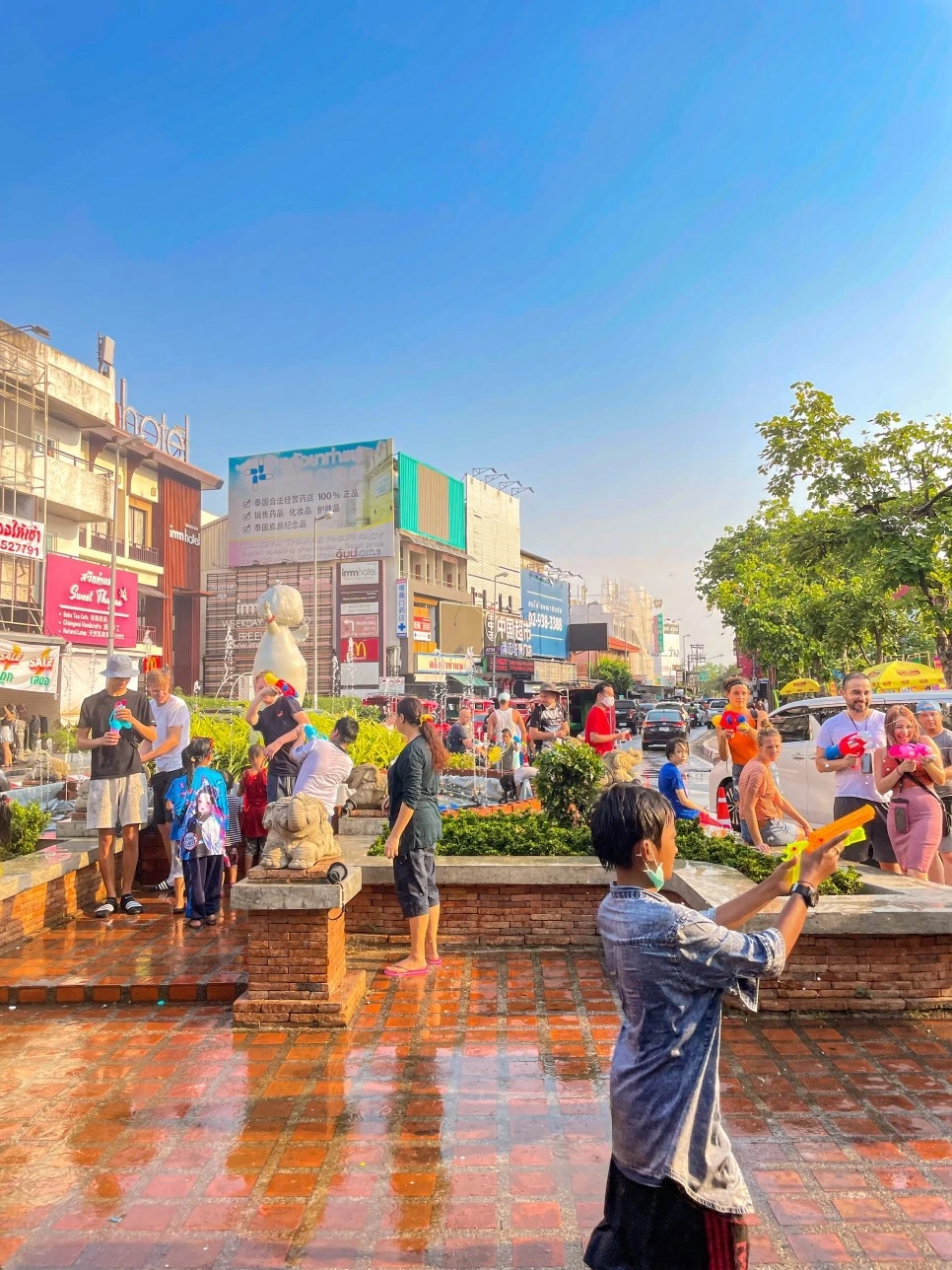 치앙마이 도시 중에서도 송크란 행사가 시작되는 타패문 앞에서 사람들이 저마다 물총을 들고 축제를 즐긴다.