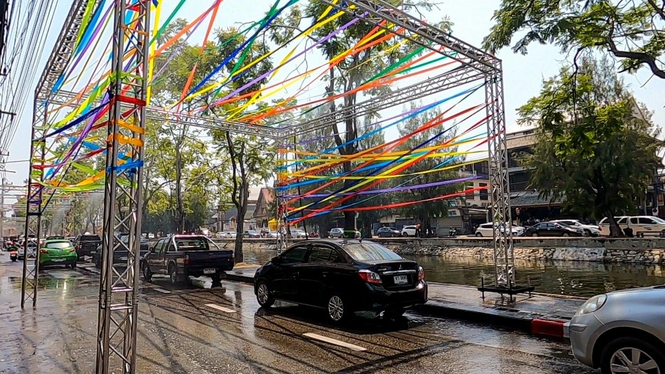 차가 지나다니는 일반 도로에도 물이 나오는 부스가 있다. 차가 지나다닐 때마다 물을 맞을 수 있게 설치해 놨으며, 송크란 기간 내내 물을 틀어놓는다.