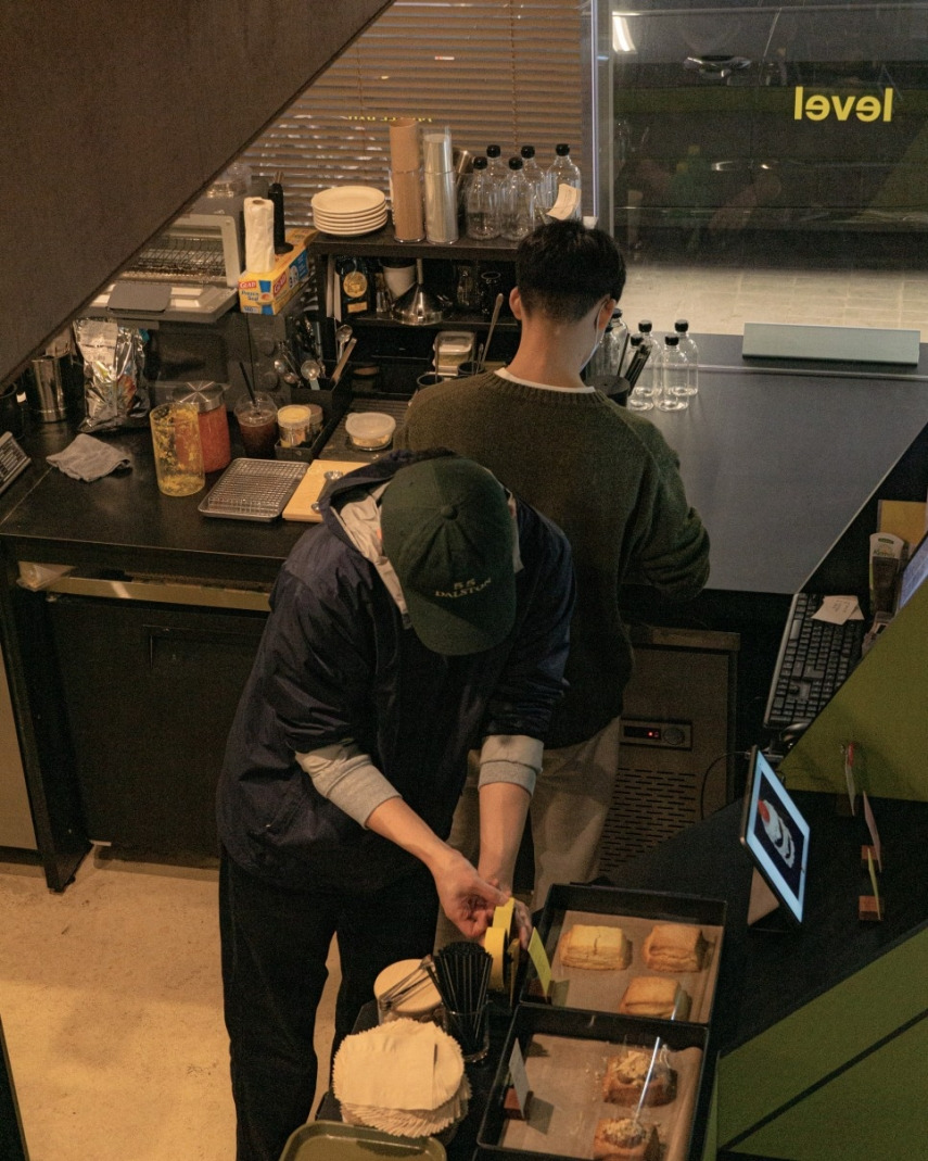 큰 공간 덕후에겐 건물 전체가 카페였으면 좋았겠지만, 레벨 커피바는 건축사무소와 다양한 오피스가 함께하고 있는 건물 1층 한편에 작게 자리 잡고 있다.