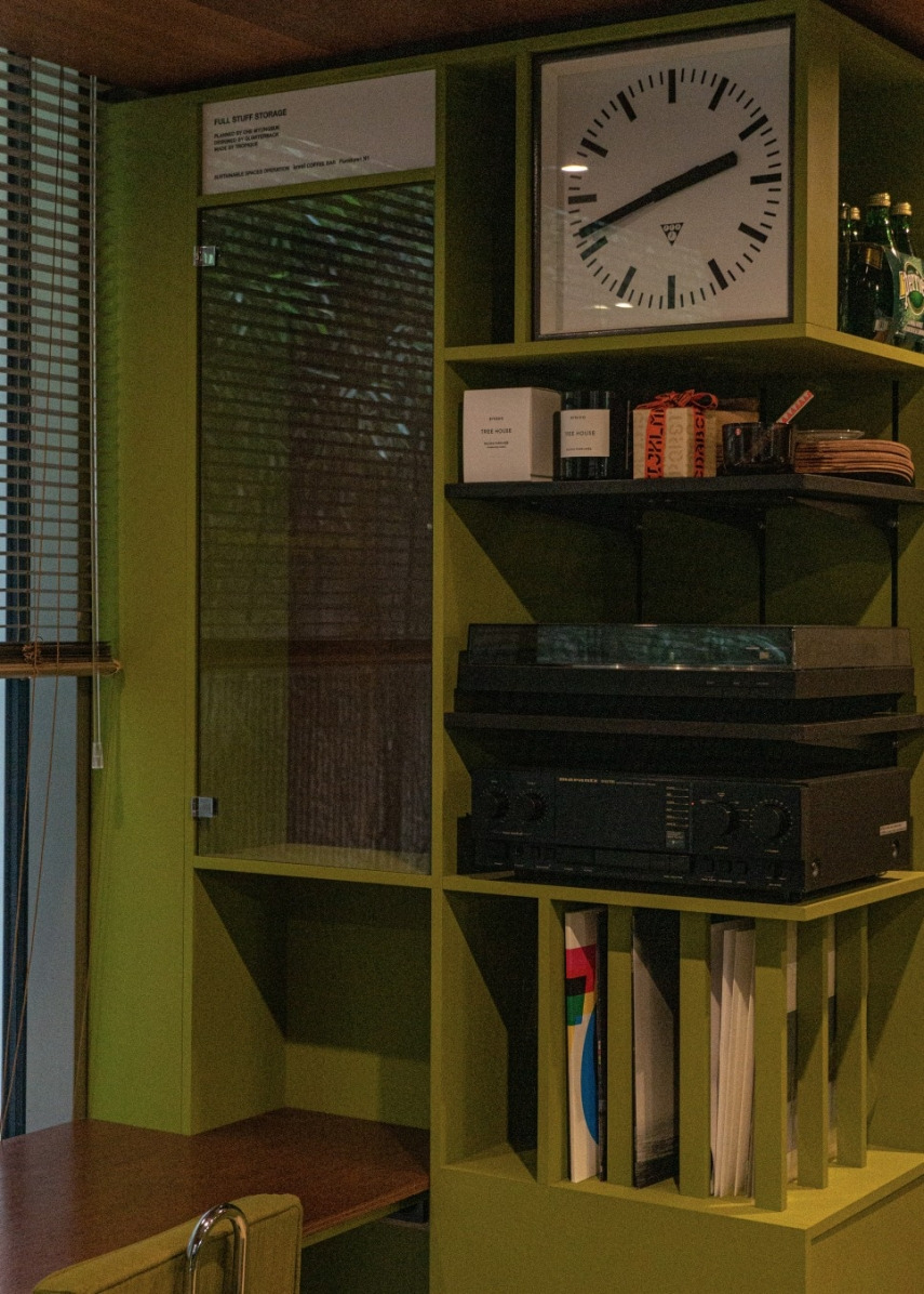 다소 어둡다 느껴질 수 있을만한 낮은 조도로 조명을 사용했다. 이는 우드의 인테리어와 만나 분위기에 무게감을 더한다. 1층과 2층 사이 배치된 스피커 사이로 나오는 LP 음악은 이곳의 차분한 무드와 조화를 이룬다.
