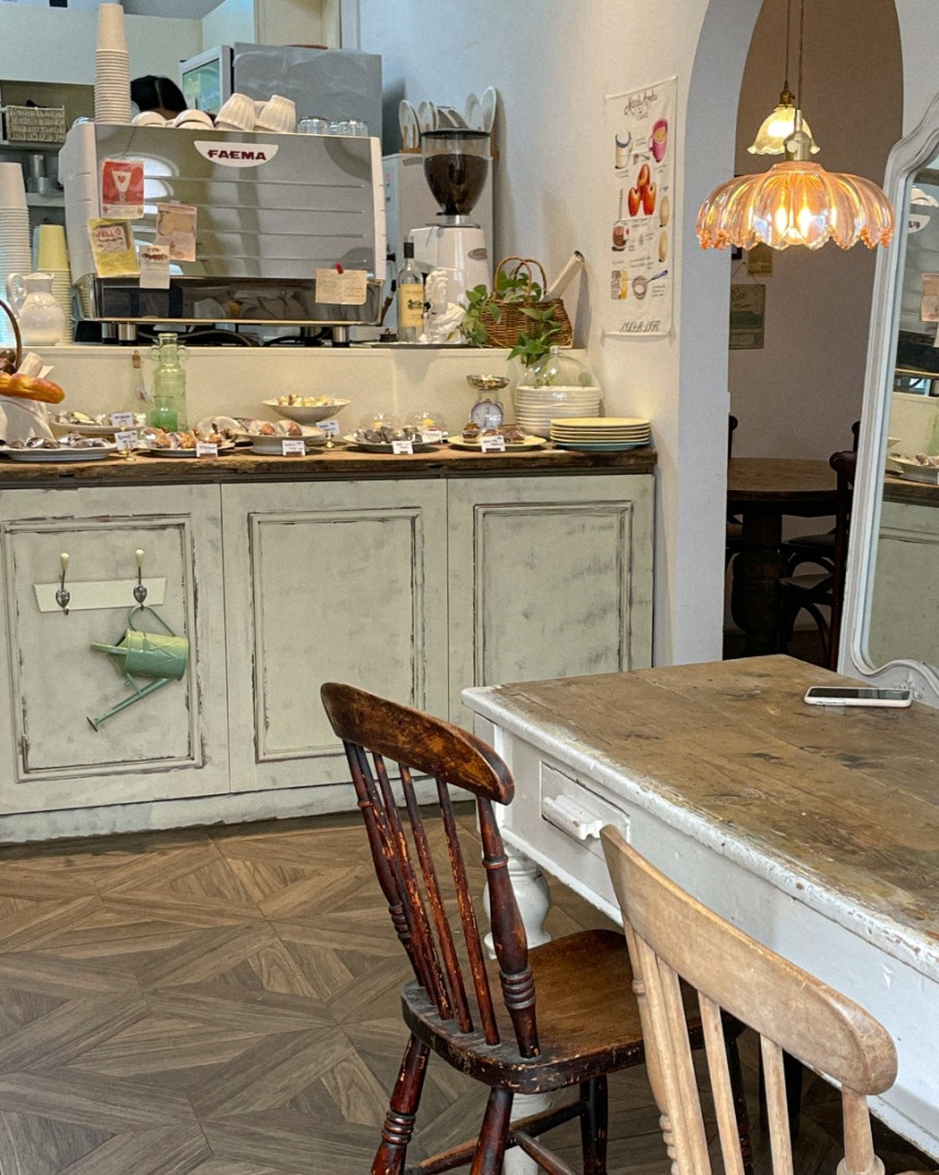유럽의 시골을 가본적 없지만, 상상해 보면 그려지는 장면들이 있다. 그중 하나는 직접 그라인더로 갈아 내린 커피와 따각거리는 커피 잔소리. 빈티지한 접시에 내오는 파이는 포인트. 전제는 굉장히 아날로그스러워야 한다는 것.