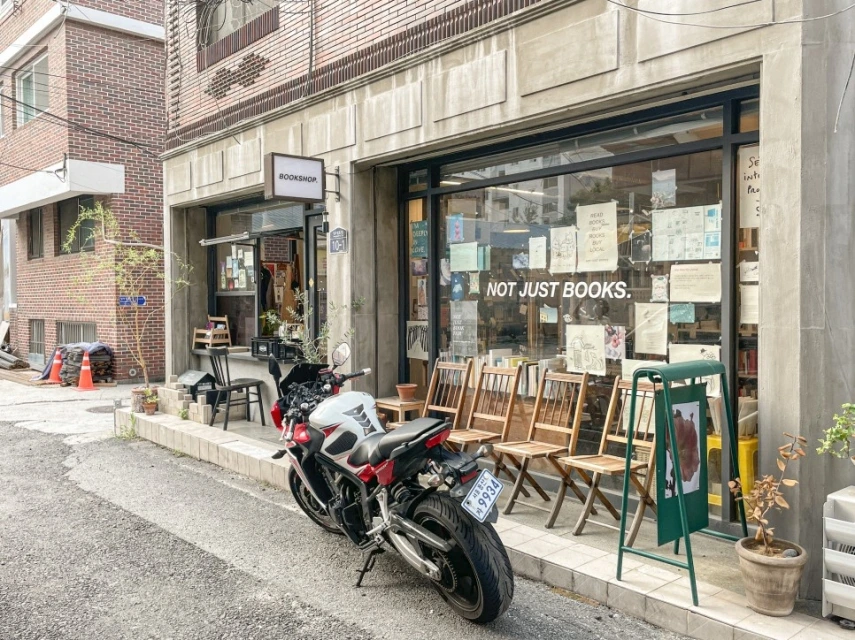 90년대 건축양식으로 개발되어 대체로 비슷한 모양의 빌라촌이 형성됐다. 겉모양은 비슷하지만, 안팎으로 브랜드 색깔을 살린 상점들이 하나 둘 생기고 있다. 오래됨과 새것의 조화와 자신들의 개성 모두를 담아냈다. 낫저스트북스도 오래됨을 자신들의 것으로 바꾼 상점 중 하나.