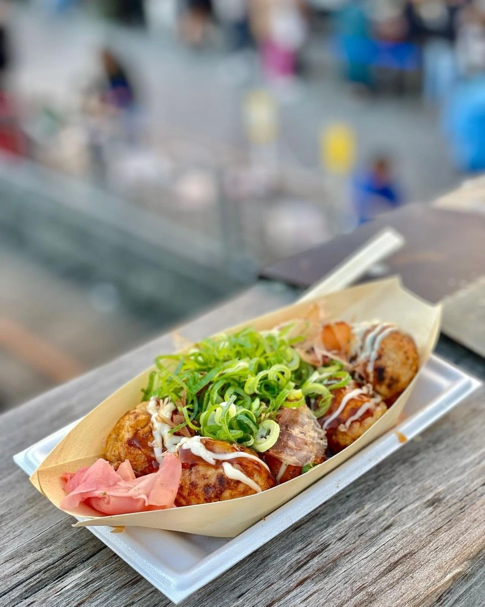 일본의 대표 길거리 음식인 타코야끼. 밀가루 반죽에 잘게 썬 문어와 파, 양배추 등을 넣어 동그랗게 구워낸 후 가쓰오부시와 달콤 짭조름한 소스를 뿌려 먹는다.