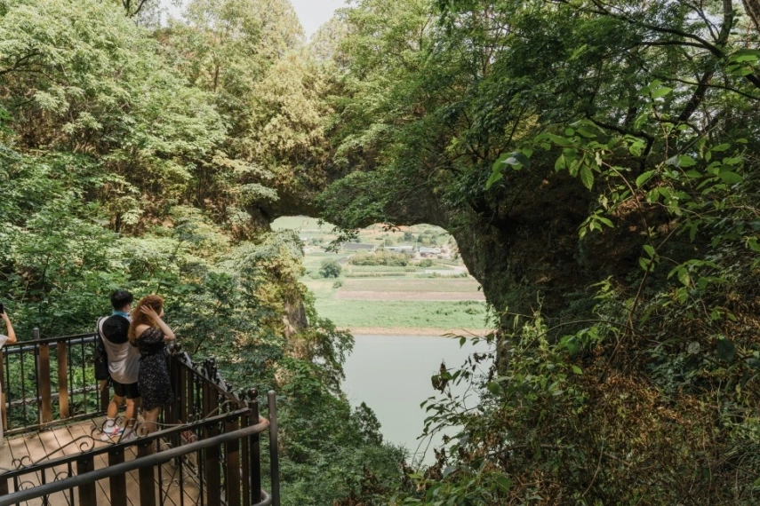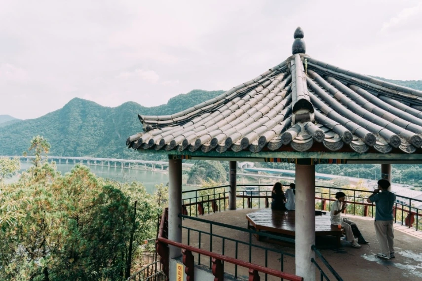 도담삼봉에 왔다면 한군데 더 들러야 할 곳이 있다. 바로 단양 8경 중 제2경인 석문. 도담삼봉에서 왕복 20분 코스라지만, 가파르고 좁은 계단을 오르내려야 해서 각별한 주의가 필요하다. 석문 가는 길에 팔각정이 나오는데, 여기에서 도담삼봉을 한눈에 내려다볼 수 있으니 숨도 돌릴 겸 잠시 쉬어보도록 하자.