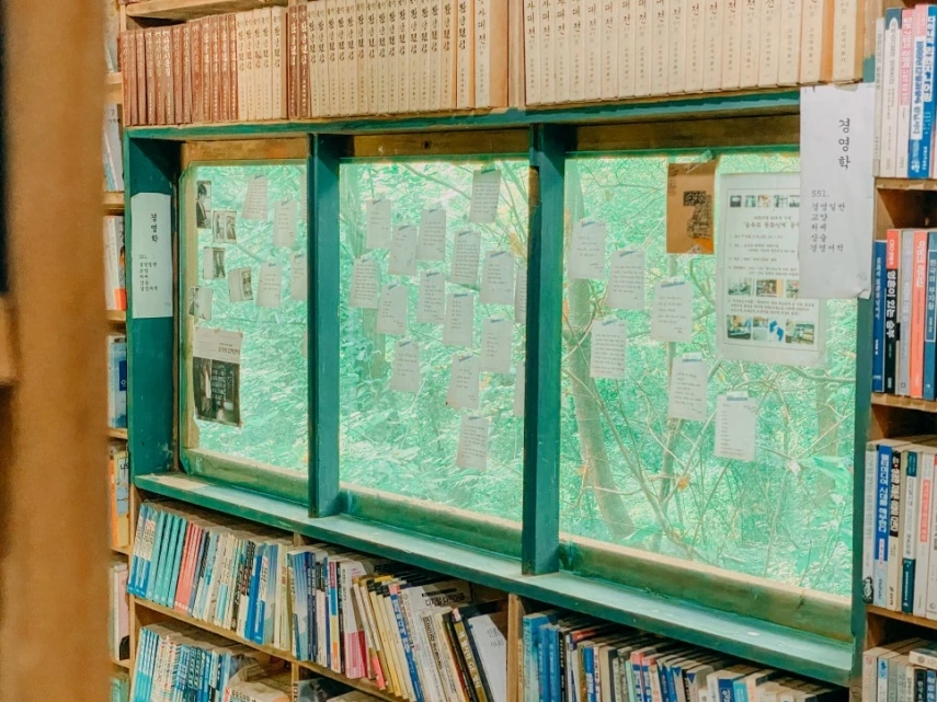 계곡을 따라 지어진 건물 내부로 들어가면 헌책방 특유의 쿰쿰한 냄새가 전해진다. 바닥도 흙바닥이라 조심해서 걸어야 먼지가 나지 않는다. 나무로 만든 책장은 천장까지 가득하다. 물소리와 새소리, 창밖으로 보이는 초록의 풍경은 빼곡히 꽂혀있는 책에 생명력을 불어넣는 것만 같다.