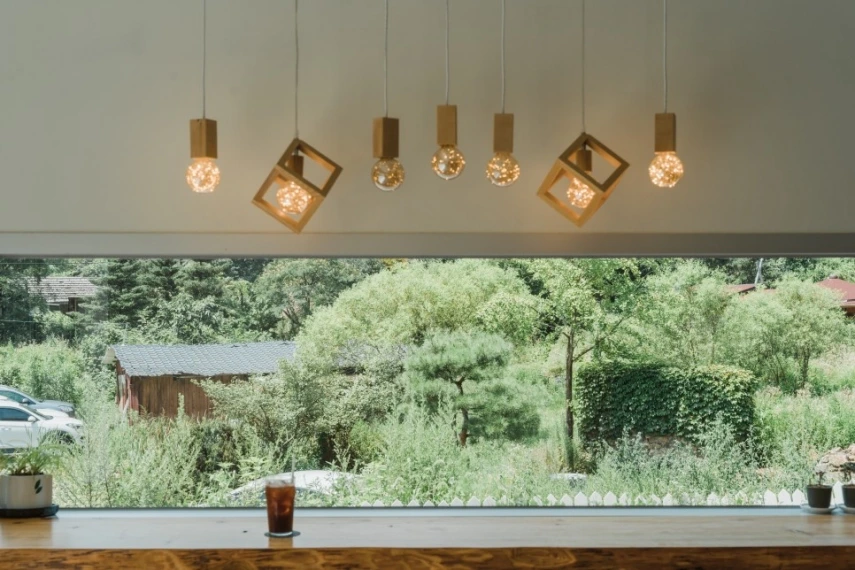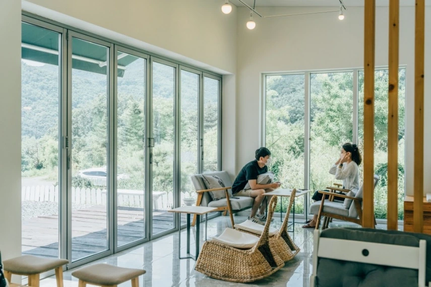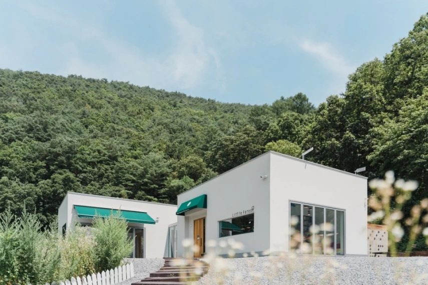 파란 하늘과 푸른 산, 하얀 건물의 조화가 그림 같다. 내부는 작은 편이지만 창이 많아 개방감이 느껴진다. 우드 앤 화이트 톤의 인테리어로 따스함을 더하고, 창밖으로 보이는 초록의 풍경은 포인트가 되어준다. 무엇보다 볕이 잘 들어 안에 있어도 숲속에 있는 느낌이랄까.