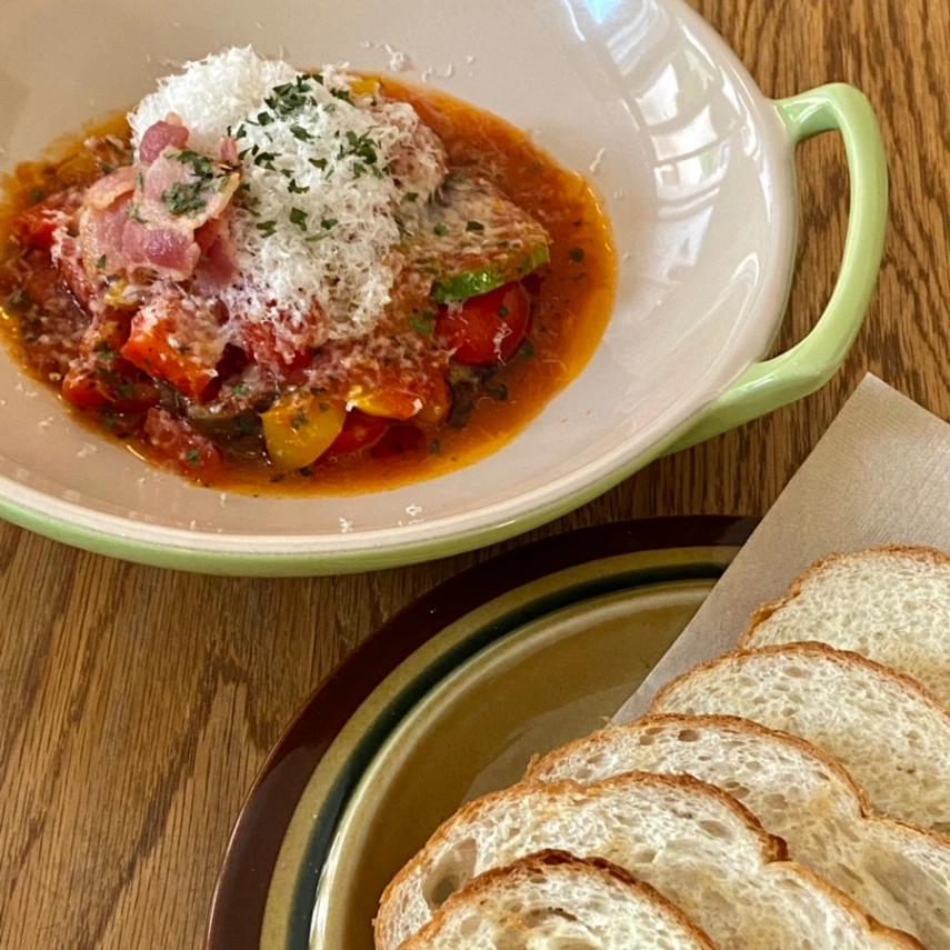 라따뚜이는 애호박, 가지, 마늘 등을 토마토소스와 함께 끓여낸 스튜 요리이다. 사실 가지의 물컹한 식감을 별로 좋아하지 않는 사람이라 처음 라따뚜이를 주문하기에 앞서 고민했다. 그러나 길어지는 고민은 시간만 잡아먹을 뿐. 이 마법의 스튜를 알고 난 뒤, 나는 가지를 좋아하는 사람이 되었다. 재료 그대로의 맛을 느낄 수 있어 조용한 가정집에 초대를 받아 식사를 하는 기분이었다. 토핑으로 베이컨이 조금 들어가긴 하지만 대부분의 식재료가 모두 채소라서 가벼운 식사를 원하는 사람들에게도 추천한다.