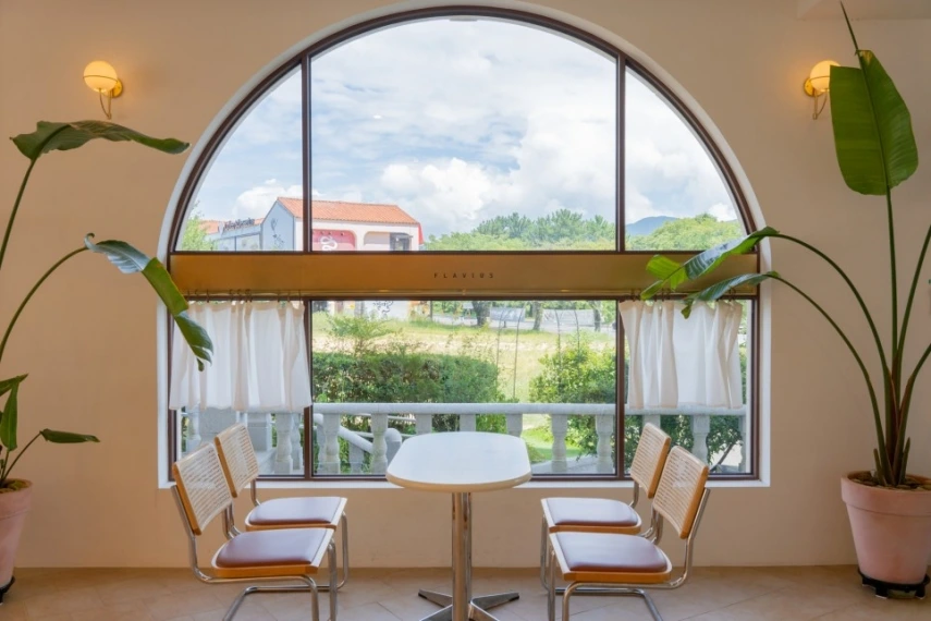 총 2층 건물로 되어있는 실내는 1층과 2층이 완전히 다른 분위기로 꾸며졌다. 트렌디하고 감각적인 인테리어로 공간을 둘러보는 재미가 있다. 창밖으로는 그림 같은 풍경이 펼쳐진다.