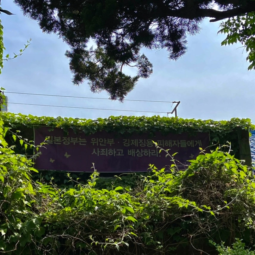 정원 구경을 마치고 돌아 나가려는 순간, 마음을 먹먹하게 만드는 현수막이 눈에 걸렸다. 결국 아픈 기억은 역사 속으로 흩어졌고 건축물은 문화재로 남았다. 이렇게 남아있는 당시 잔재들을 통해 우리가 정말로 곱씹어 봐야 했던 것은 이런 문장이 아니었을까.
