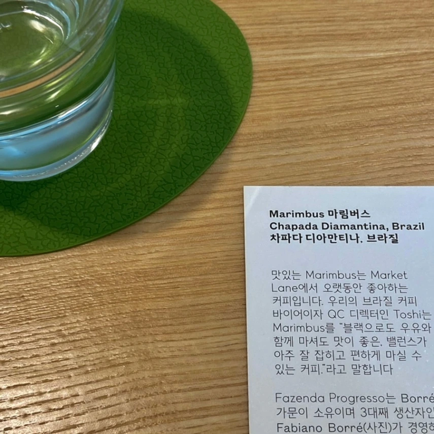 원두는 두 가지 중 하나로 선택할 수 있다. 사장님이 직접 꼼꼼히 따져가며 계약한 곳들의 원두를 사용한다. 플랫 화이트로 맛보았던 원두는 마림버스의 차파다 디아만티나 브라질. 다크초콜릿의 깊은 풍미와 상큼한 끝 맛이 매력적이다. 특별했던 점은 커피를 마시기 전 물 한 잔을 먼저 내어주신다. 커피를 마시는 동안 깔끔하게 입을 헹구고 매번 맛을 예민하게 느낄 수 있도록 하기 위한 작은 배려일까나.