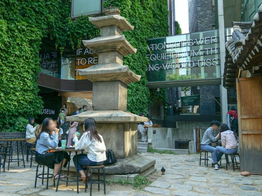 입구에서부터 고즈넉한 느낌이 마음에 든다. 높게 쌓아올린 갈색 벽돌 건물, 노출 콘크리트와 통유리를 섞은 현대식 건물, 기와와 나무로 된 한옥. 아마 이 세 가지를 한곳에서 볼 수 있는 곳은 흔치 않을 거다. 전혀 어울릴 거 같지 않지만, 한국적인 공간으로 풀어내 어색함 없이 조화를 이루고 있다. 3면이 서로 다른 모습으로 높게 벽을 이루고, 하늘은 오픈 되어있어 시원한 개방감을 준다. 동시에 실외지만 적당한 아늑함도 든다.