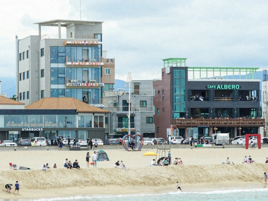 경포대나 안목에 비해 덜 유명하지만 점점 개발되어 지금은 굉장히 쾌적한 시설의 해변이 됐다. 기존엔 식당, 카페 몇 개만 있는 작고 아담한 해변이었지만 지금은 카페거리라 해도 될 만큼 카페와 음식점이 많아졌다.