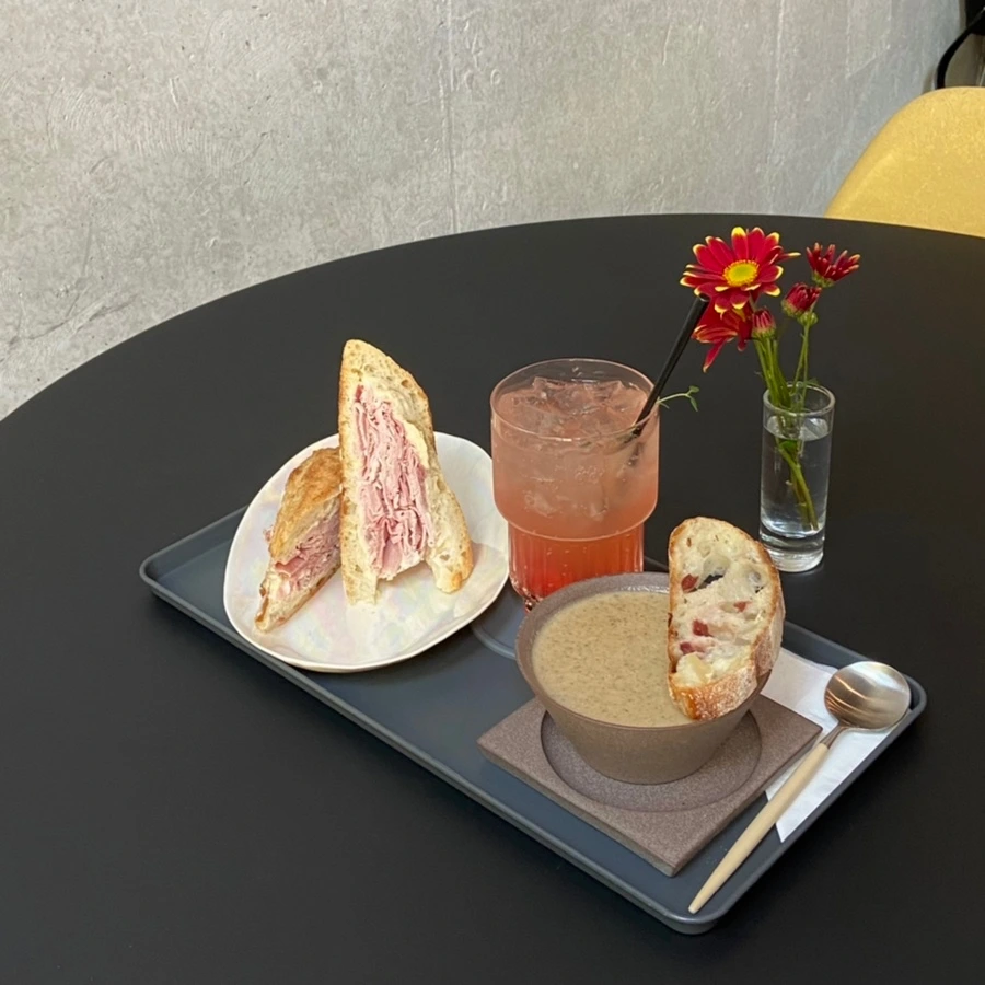브런치를 즐기러 왔던 나는 바게트 빵에 얇게 저민 햄과 버터를 넣어 만든 잠봉뵈르와 양송이 수프, 그리고 방울토마토 시소 에이드를 주문했다. 속을 데우기 위해 주문한 양송이 수프. 떠먹기 적당한 농도와 은은하게 퍼지는 트러플 향이 기분 좋았다. 풍부한 양의 햄과 고소한 버터의 조합으로 이뤄진 잠봉뵈르는 말할 것도 없고 에이드 역시 흔하게 맛볼 수 있는 종류가 아니라 특별했다.
