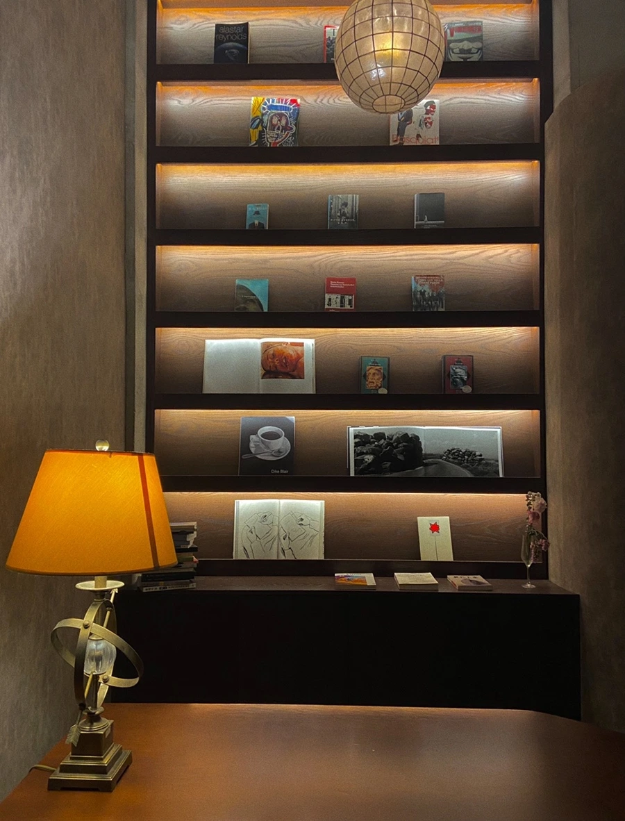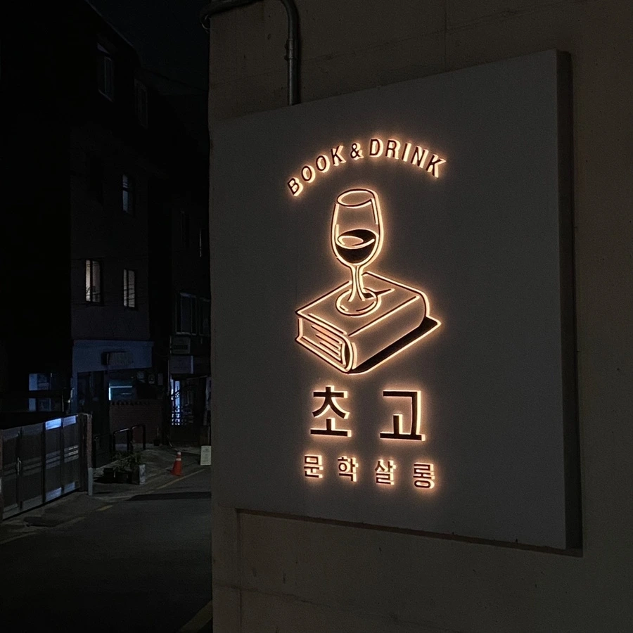문학살롱 초고는 책과 술을 함께 파는 '북바(book bar)'이다. 칵테일을 팔지만 대화를 하기보단 읽거나 쓰기 위해 오는 사람들이 많다. 그래서인지 홀로 방문하는 사람들이 많았던 곳. 전체적으로 노랗고 어두운 분위기지만 테이블마다 스탠드가 있어 글을 읽어내리는 데에 무리는 없다.