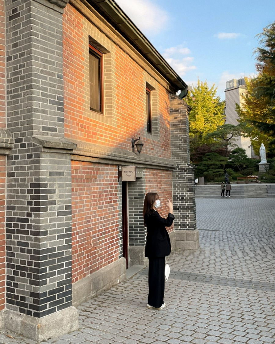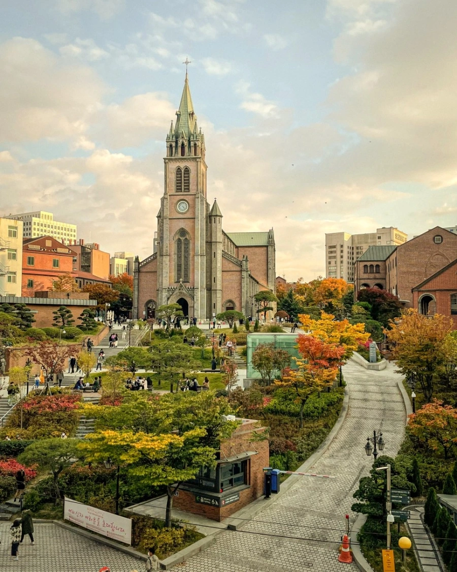 명동성당은 공원 정도의 크기로 작지 않은 규모인데, 120년의 세월 동안 그 자리를 잘 보존해왔다. 도심 속 돌바닥과 돌계단을 밟는 것만으로도 잠시나마 여행을 떠나게 해주는데, 곳곳에 아름다운 건축물과 가을볕 그리고 나뭇잎이 그 매력을 더해준다.