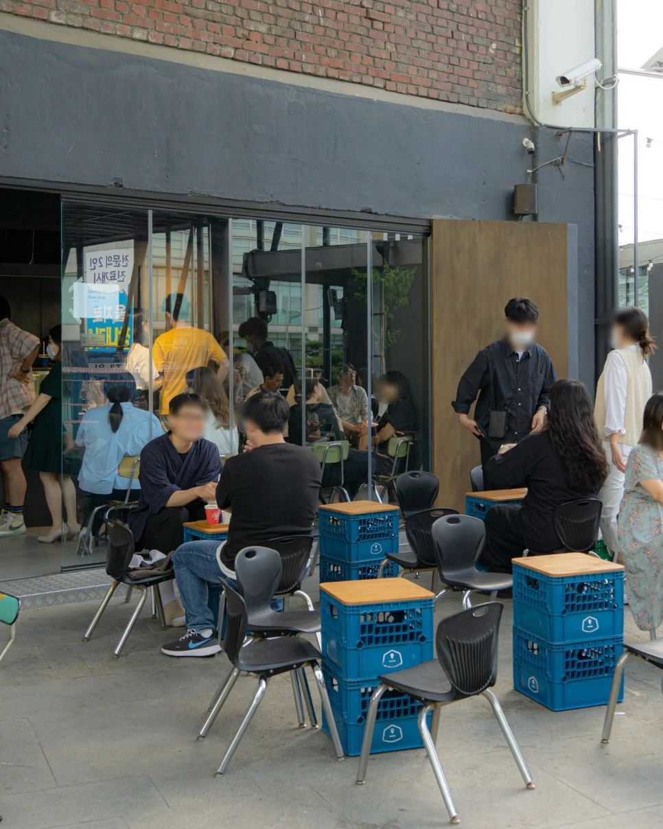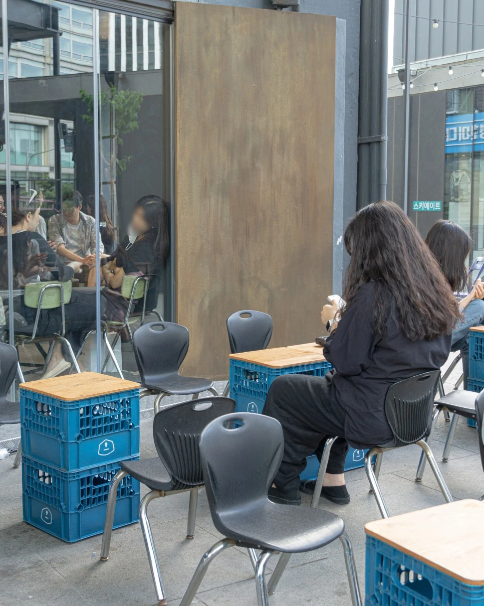 챔프커피의 매장 실내 공간은 넓지 않다. 그렇지만 이곳에 간 이유는 아무렇게나 놓인 외부 공간이었기 때문에 크게 상관없었다. 낮은 의자와 플라스틱 박스로 된 테이블, 편안한 좌석은 아니지만 을지로의 후리함(?)을 즐기는데 이만한 것도 없겠다.