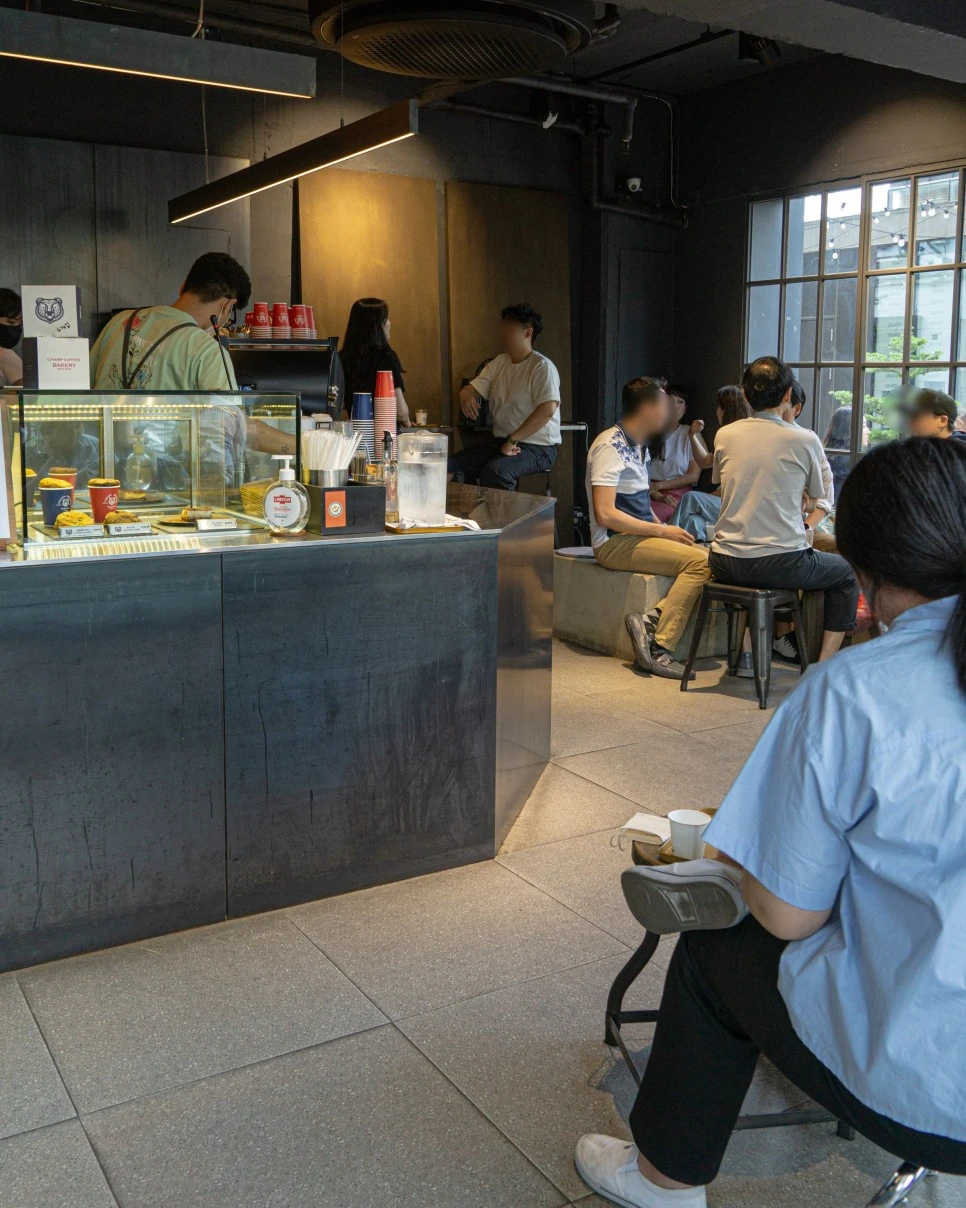 챔프 커피도 최소한의 공사로 레트로한 무드를 유지했다. 바 테이블이나 조명은 세련되고 깔끔하게 전개했지만, 외벽이나 바닥재는 있는 그대로를 사용해 세운상가의 감성을 잘 이어받고 있다.