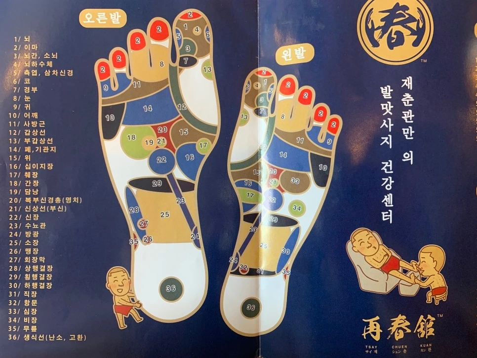 대망의 15분 발마사지. 발마사지가 시작되기 전 책자 하나를 건네받았다. 한국어로 발 지압 부위에 대한 설명이 쓰여있는 책자이다. 만약 마사지사가 발의 어느 곳을 지압할 때 아팠다면 그 부위가 좋지 않은 것.