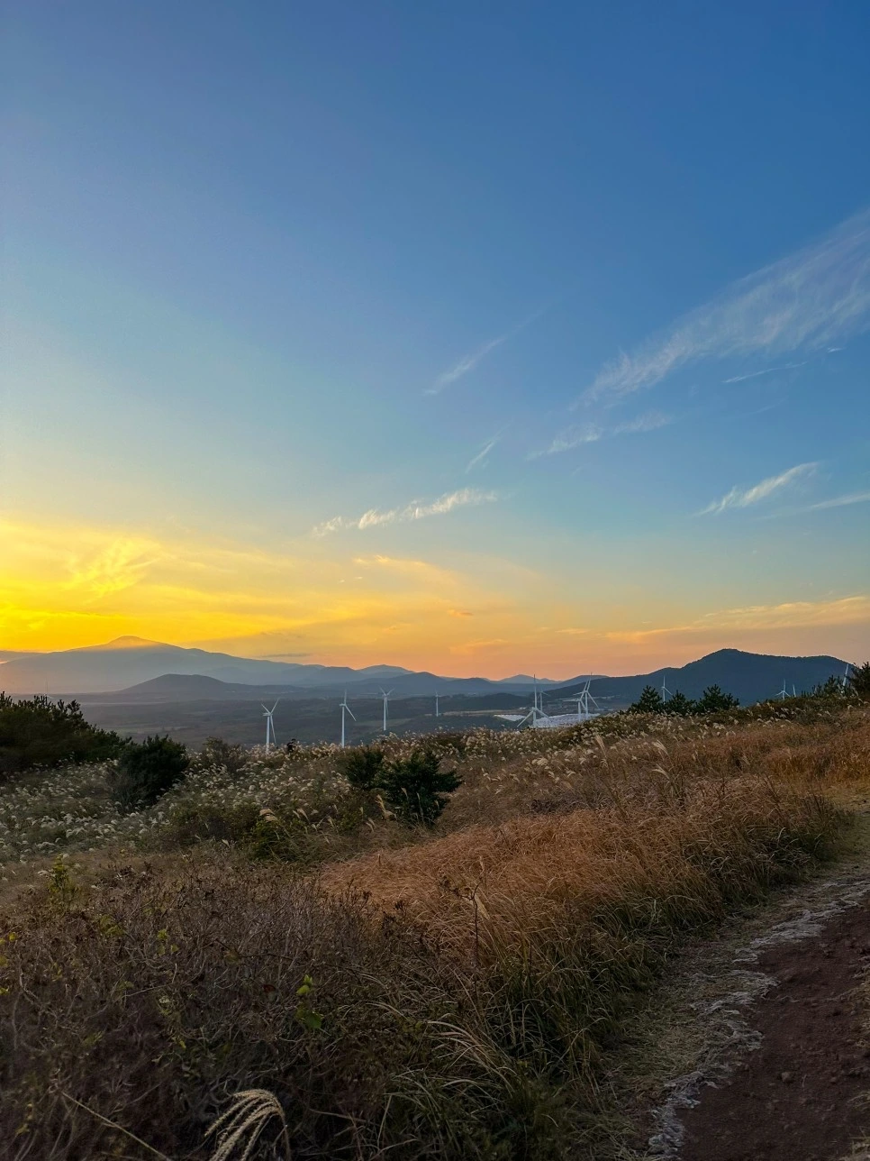 정상에 가까워질수록 억새들이 바람에 날리는 모습을 볼 수 있다. 억새밭 너머로는 풍차도 보인다. 위에서 바라보는 풍경이 말로 이루지 못할 만큼 아름답다.